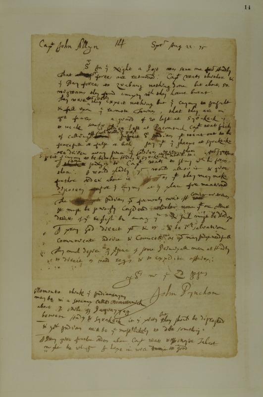 Letter from John Pynchon to Captain John Allyn in regard to Indians and Massachusetts Forces under Captain Watts