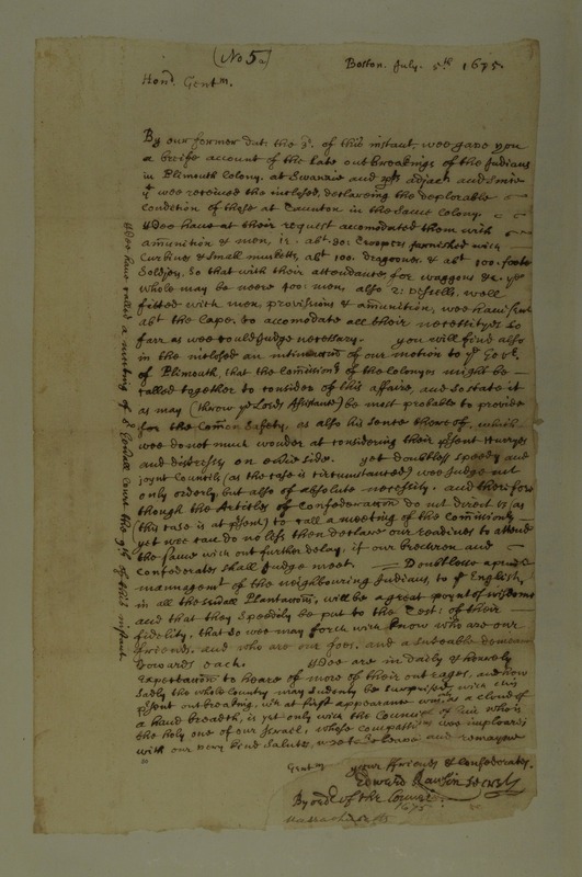 Letter from Edward Rawson to the Governor and Council of Connecticut, in relation to the Indian War in Plymouth Colony