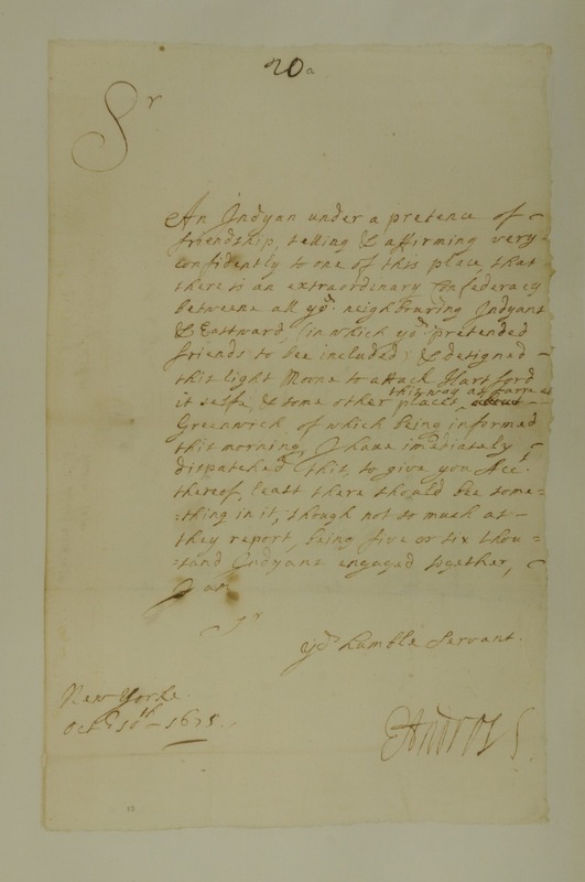Letter from Edmond Andros to Deputy Governor William Leete, Giving an Indian's Account of a Confederacy to Attack Hartford and Greenwich