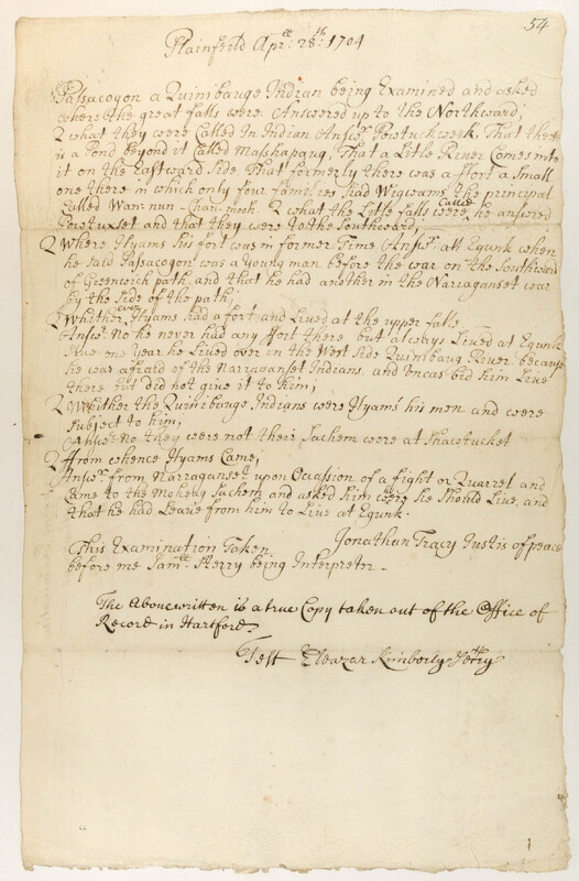 Copy of Passacogon's Examination and Testimony regarding Quinebaug Country