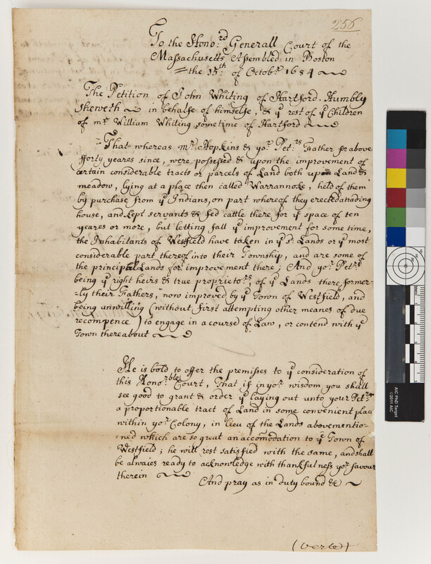 Petition of John Whiting to the General Court of the Colony of Massachusetts regarding Land at Westfield