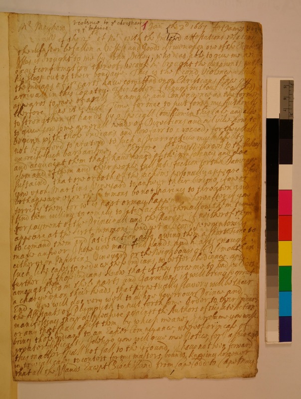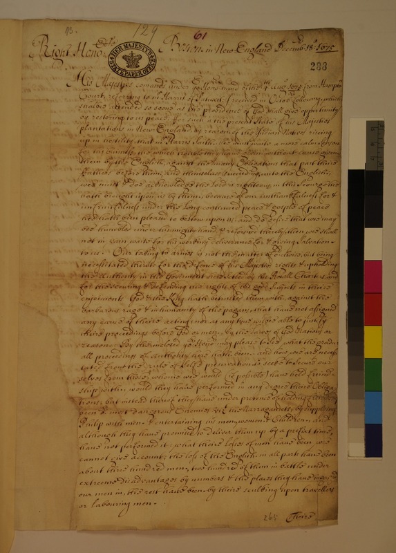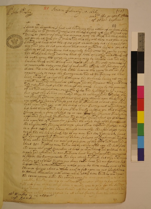 Letter from John Leverett to Joseph Williamson concerning the Narragansetts and King Philip's War