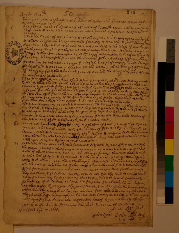 Copy of a Letter from the Colony of Connecticut to His Majesty's Secretary of State regarding Narragansett Country