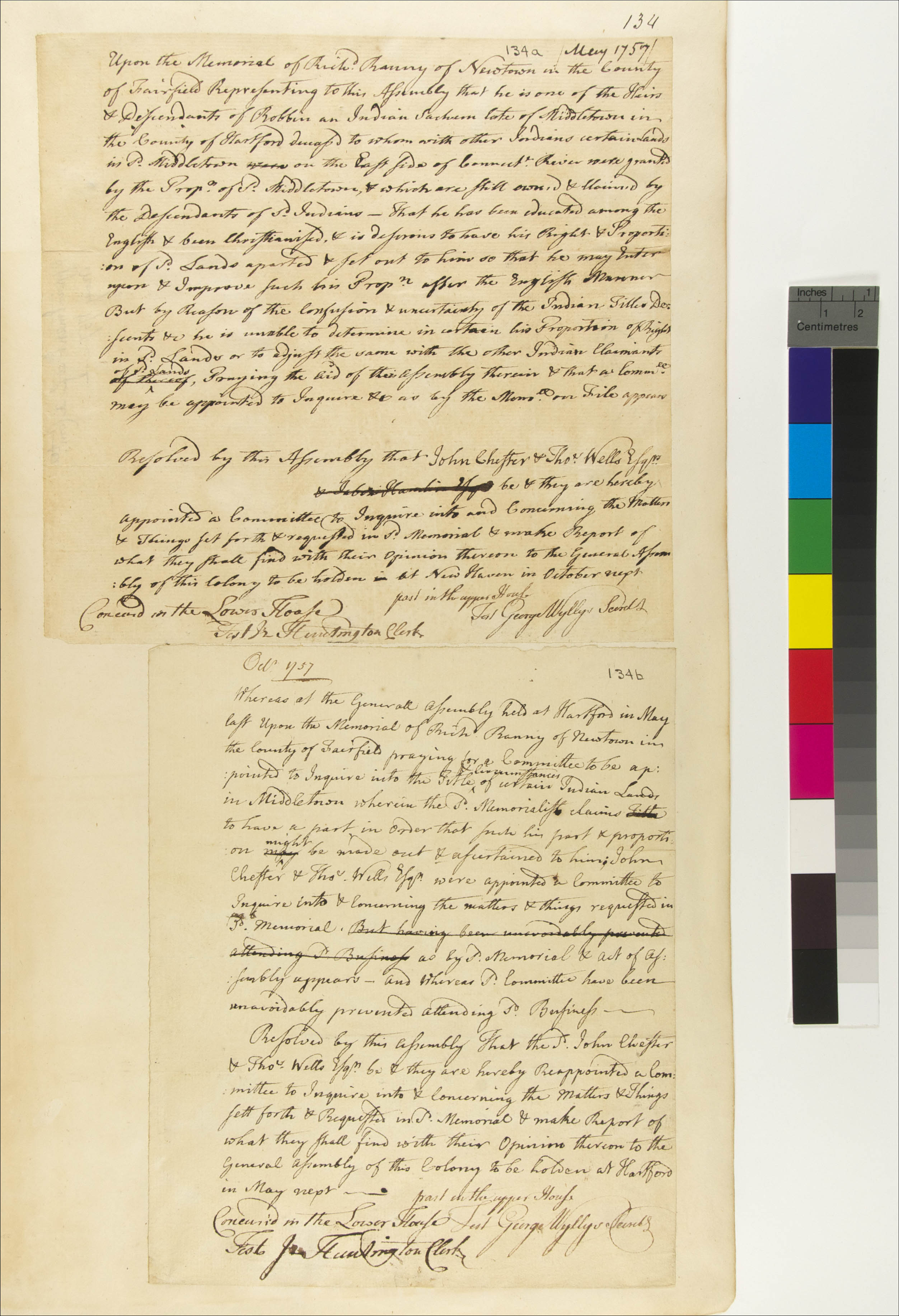 Education/Schools; Genealogy; Government -- Colonial -- Colony of Connecticut -- General Assembly; Government -- Tribal -- Wangunk -- Sachems/Sagamores -- Doctor Robin; Land -- Conveyances -- Deed/Title; Land -- Description -- Boundaries; Land -- Reservation/Reserve -- Wangunk; Landforms -- Aquatic -- Rivers -- Connecticut; Law -- Legislative Process -- Acts/Resolves -- Accepted; Law -- Legislative Process -- Appointment -- Accepted; Law -- Legislative Process -- Petitions -- Accepted; Relations -- Colonial Affairs; Relations -- Tribal Affairs; Religion/Beliefs -- Christianity; Tribes/Communities -- Wangunk; YIPP -- Colony of Connecticut Collection, 1603-1783