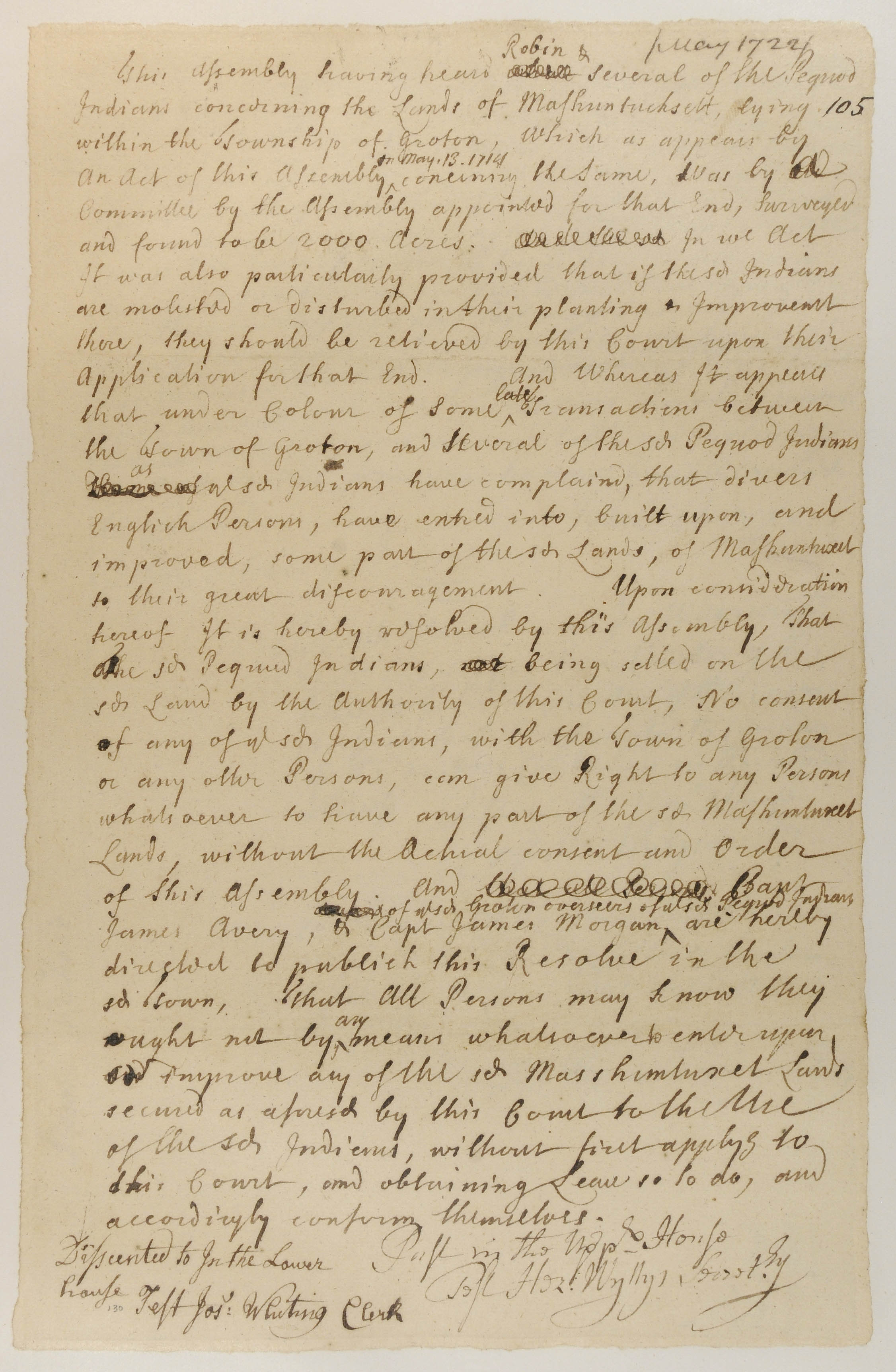 Government -- Colonial -- Colony of Connecticut -- Guardians/Overseers; Government -- Colonial -- Colony of Connecticut; Government -- Tribal -- Pequot -- Western -- Sachems/Sagamores -- Robin Cassasinamon II ( -1722); Land -- Complaints -- Encroachment -- Neighbors; Land -- Complaints -- Encroachment; Land -- Complaints; Land -- Reservation/Reserve -- Pequot -- Western; Land -- Use -- Improvement -- Agriculture -- Damage to; Land -- Use -- Improvement -- Building; Land -- Use -- Improvement; Law -- Legislative Process -- Acts/Resolves -- Rejected; Relations -- Colonial Affairs; Relations -- Tribal Affairs; Tribes/Communities -- Pequot -- Western; YIPP -- Colony of Connecticut Collection, 1603-1783