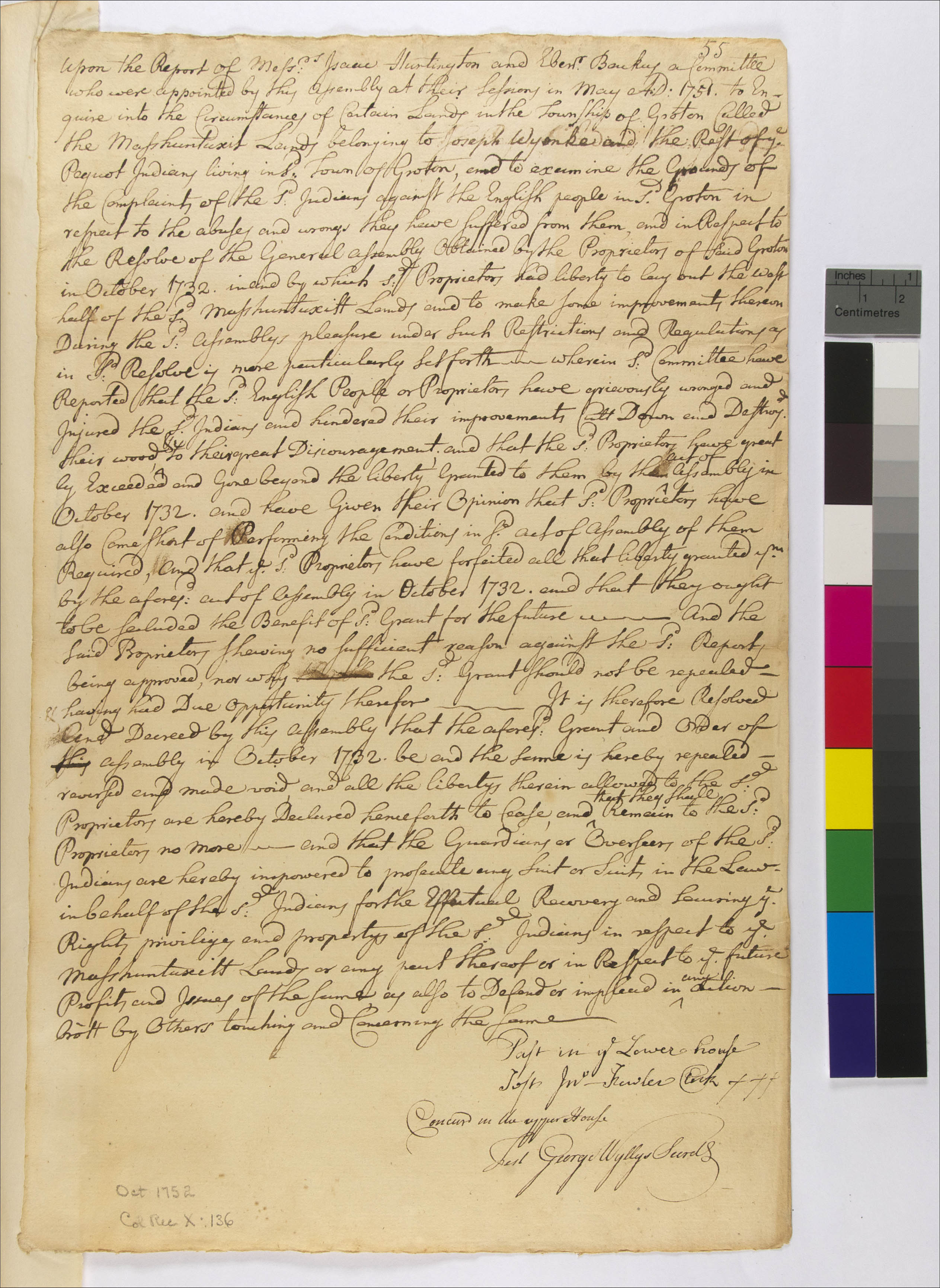 Government -- Colonial -- Colony of Connecticut -- General Assembly -- Committees; Government -- Colonial -- Colony of Connecticut -- General Assembly; Government -- Colonial -- Colony of Connecticut -- Guardians/Overseers; Government -- Colonial -- Colony of Connecticut -- Towns -- Groton; Government -- Tribal -- Pequot -- Western -- Sachems/Sagamores -- Joseph Wyoke (1747-c. 1761); Land -- Complaints -- Encroachment -- Neighbors; Land -- Complaints -- Trespass; Land -- Complaints -- Vandalism; Land -- Complaints; Land -- Reservation/Reserve -- Pequot -- Western; Land -- Use -- Improvement -- Agriculture -- Damage to; Land -- Use -- Timber/Firewood; Law -- Legislative Process -- Acts/Resolves -- Accepted; Relations -- Colonial Affairs; Relations -- Tribal Affairs; Tribes/Communities -- Pequot -- Western; YIPP -- Colony of Connecticut Collection, 1603-1783