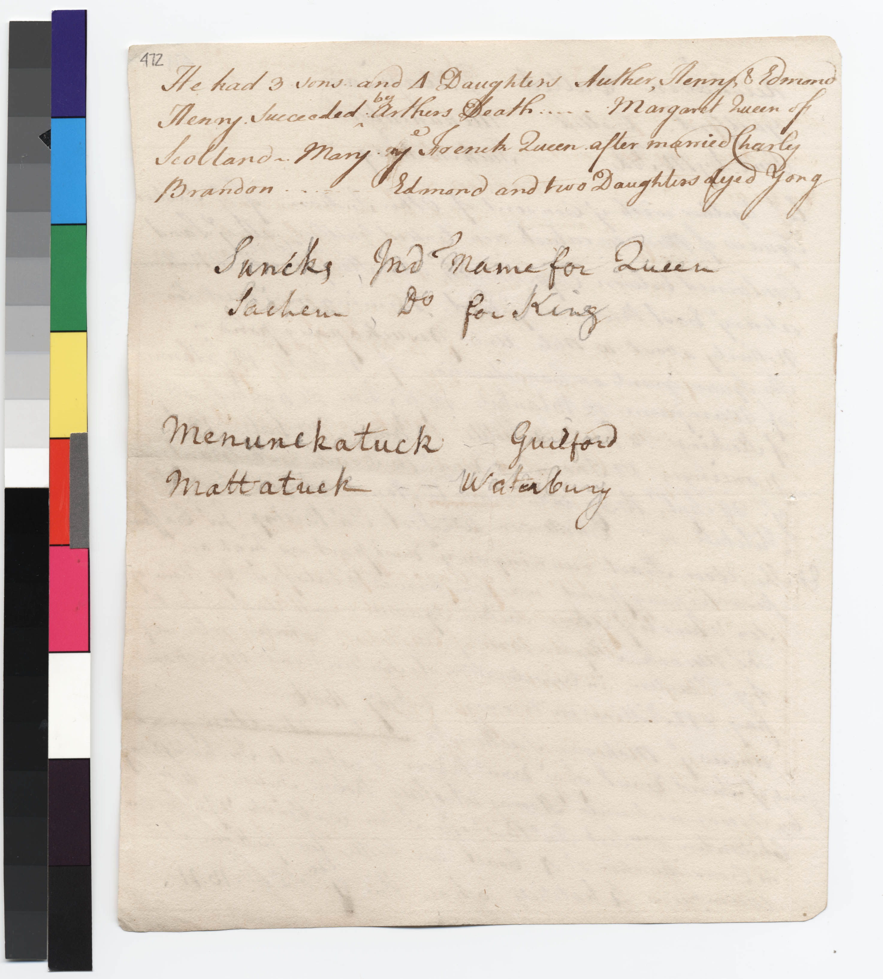 Culture -- Leadership -- Sachems; Geography -- Place Names; Language -- Algonquian; Repository -- Yale University -- Beinecke Library; Tribes/Communities -- Mattatuck; Tribes/Communities -- Menunketesuck; YIPP -- Colony of Connecticut Collection, 1603-1783