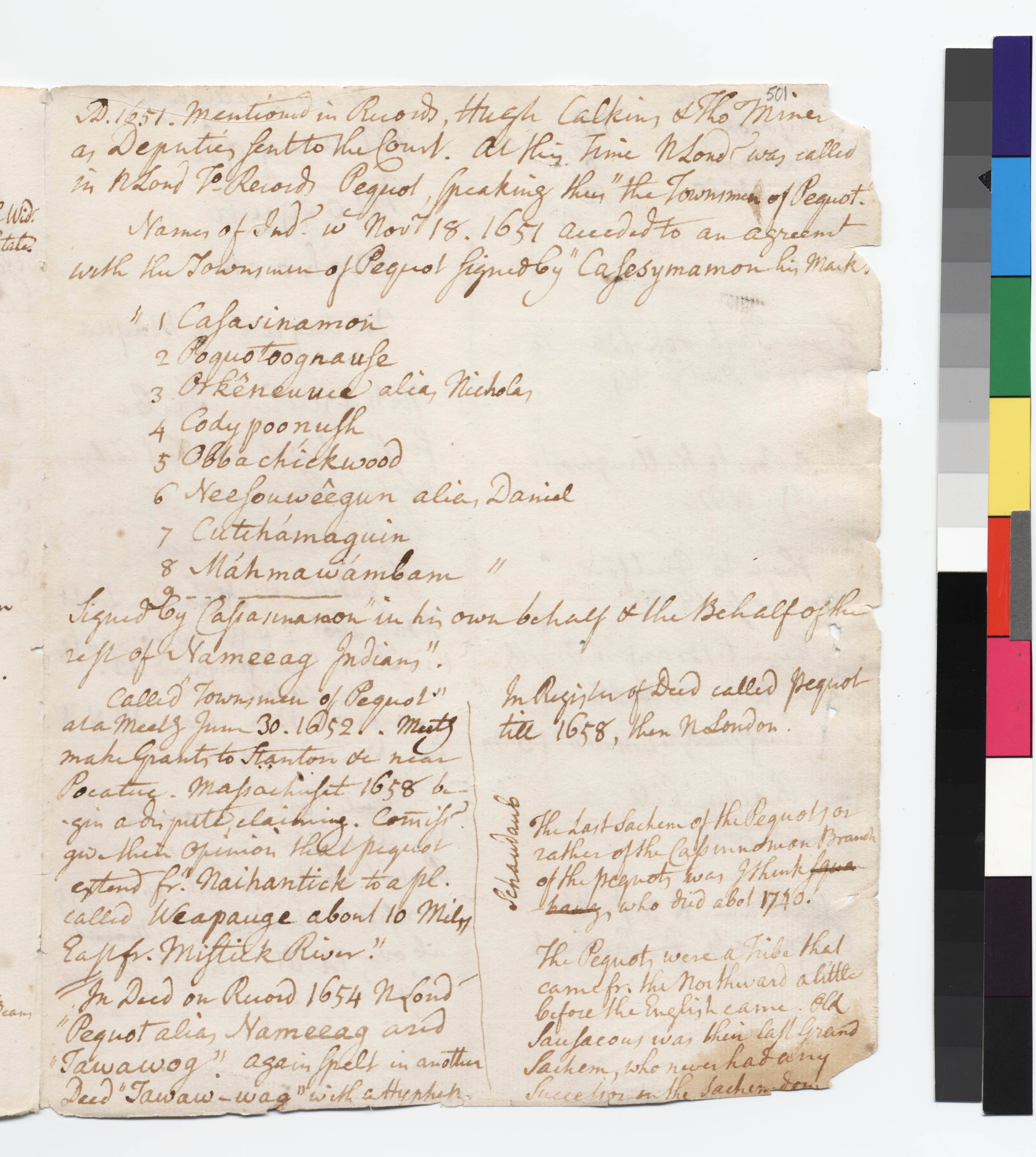 Culture -- Leadership -- Sachems; Geography -- Place Names; Government -- Colonial -- Colony of Connecticut -- General Court; Government -- Colonial -- Colony of Connecticut -- Towns -- New London; Government -- Tribal -- Pequot -- Western -- Sachems/Sagamores -- Robin Cassasinamon I (1647-1692); Land -- Complaints -- Controversies; Land -- Conveyances -- Deed/Title; Land -- Description -- Boundaries; Relations -- Colonial Affairs; Relations -- Tribal Affairs; Repository -- Yale University -- Beinecke Library; Tribes/Communities -- Narragansett; Tribes/Communities -- Niantic -- Western; Tribes/Communities -- Pequot; YIPP -- Colony of Connecticut Collection, 1603-1783