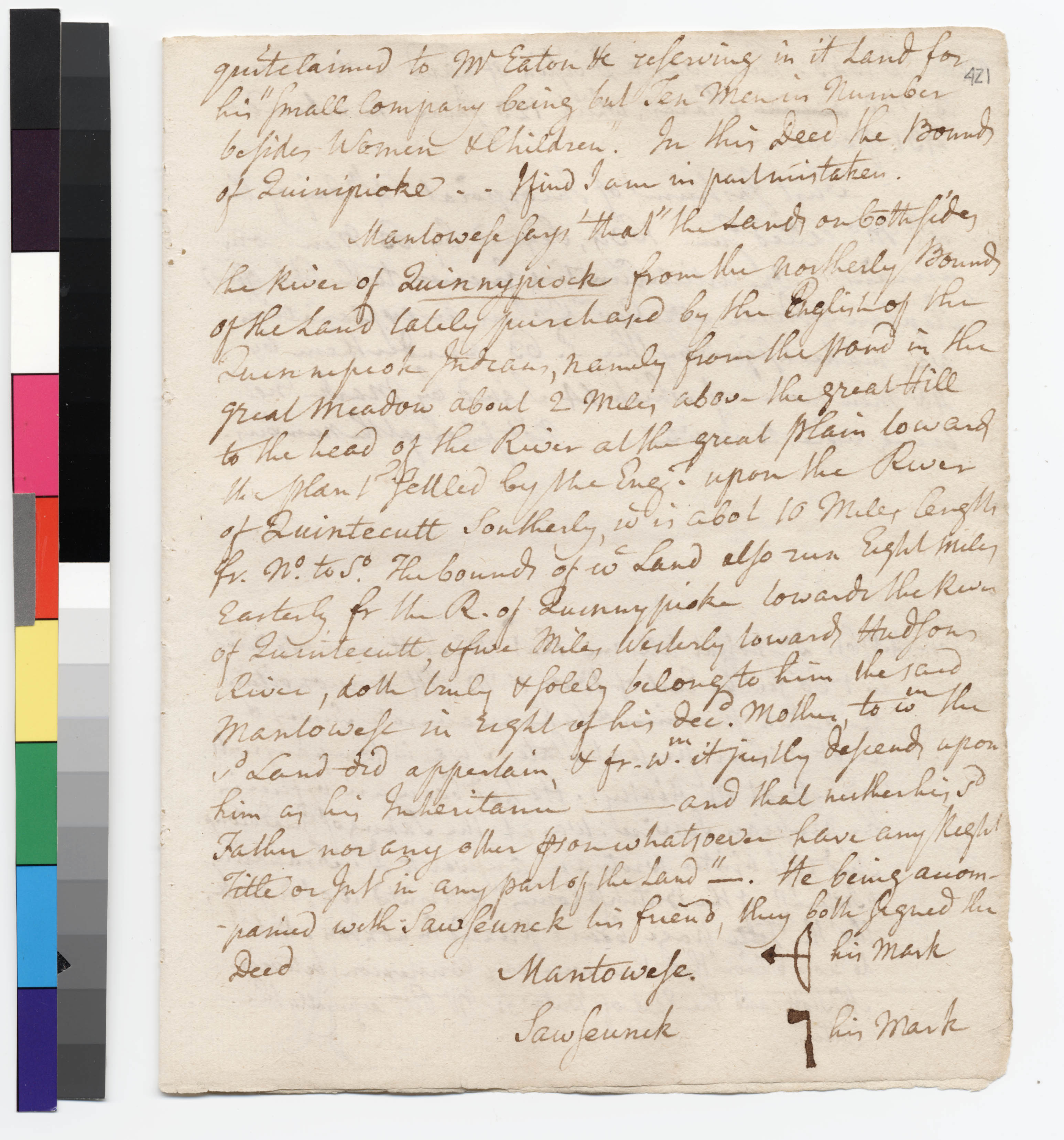 Clothing -- Coats; Culture -- Genealogy; Genealogy; Government -- Colonial -- New Haven Colony; Government -- Tribal -- Quinnipiac -- Sachems/Sagamores -- Momaugin; Household Goods -- Kitchenware -- Spoons; Household Goods -- Porringer; Household Goods -- Scissors; Land -- Conveyances -- Deed/Title; Land -- Description -- Boundaries; Land -- Reservation/Reserve -- Quinnipiac; Landforms -- Aquatic -- Harbors; Landforms -- Aquatic -- Rivers -- Connecticut; Landforms -- Aquatic -- Rivers -- Hudson; Landforms -- Aquatic -- Rivers -- Quinnipiac; Landforms -- Terrestrial -- Hills; Landforms -- Terrestrial -- Meadows; Law -- Property -- Inheritance; Military -- Forts; Relations -- Colonial Affairs; Relations -- Tribal Affairs; Repository -- Yale University -- Beinecke Library; Tool/Weapon -- Axes/Hatchets; Tool/Weapon -- Hoes; Tool/Weapon -- Knives; Tribes/Communities -- Mattabesecs; Tribes/Communities -- Quinnipiac; Tribes/Communities -- Totoket; YIPP -- Colony of Connecticut Collection, 1603-1783