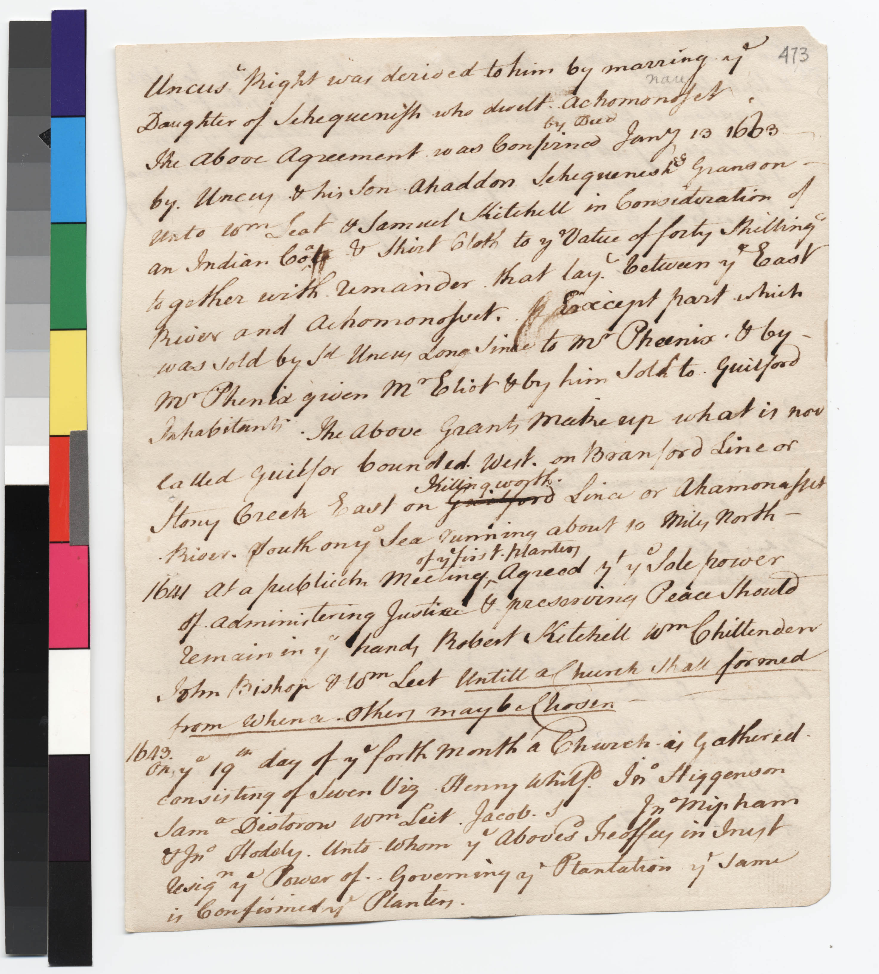 Abstract Ideas -- Authority; Abstract Ideas -- Peace & Friendship; Clothing -- Coats; Culture -- Family -- Marriages; Culture -- Genealogy; Culture -- Leadership -- Sachems; Genealogy; Government -- Colonial -- Colony of Connecticut -- Towns -- Guilford; Government -- Tribal -- Hammonasset; Household Goods -- Cloth; Land -- Conveyances -- Deed/Title; Land -- Conveyances -- Grants; Land -- Description -- Boundaries; Landforms -- Aquatic -- Rivers; Landforms -- Aquatic -- Seas; Relations -- Colonial Affairs; Relations -- Tribal Affairs; Religion/Beliefs -- Christianity -- Church/Chapel; Repository -- Yale University -- Beinecke Library; Tribes/Communities -- Hammonasset; Tribes/Communities -- Mohegan