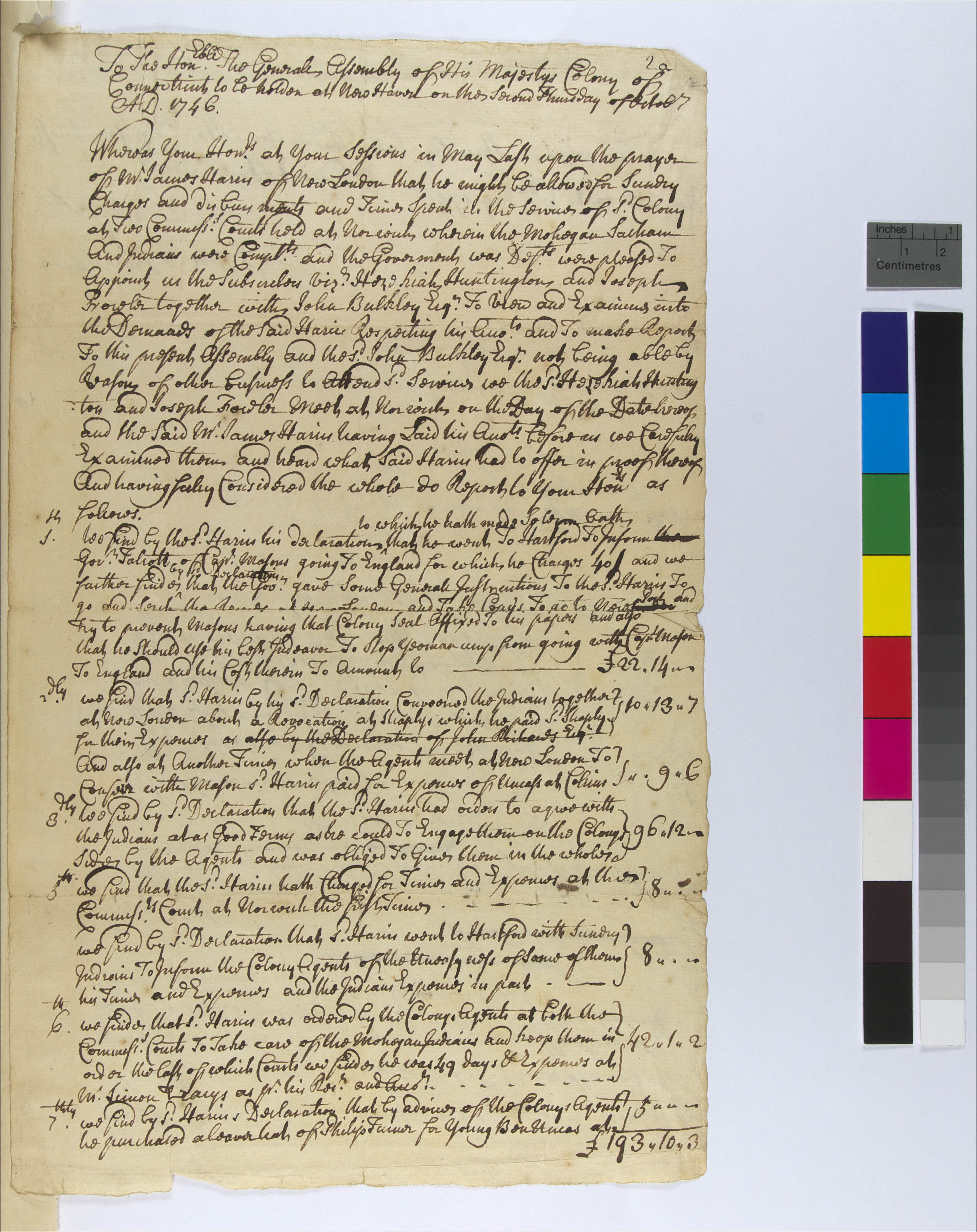 Accounting/Finance -- Accounting; Government -- Colonial -- Colony of Connecticut -- General Assembly -- Committees; Government -- Colonial -- Colony of Connecticut -- General Assembly; Government -- Colonial -- Colony of Connecticut; Government -- Tribal -- Mohegan -- Mason Faction -- Sachems/Sagamores -- John Uncas (1736-c.1769); Government -- Tribal -- Mohegan -- Pro-Government Faction -- Sachems/Sagamores -- Ben Uncas II (1726-1746); Land -- Complaints -- Controversies -- Mohegan Case; Land -- Reservation/Reserve -- Mohegan; Law -- Imperial Actions -- Commissions of Review; Law -- Legislative Process -- Reports -- Accepted; Relations -- Colonial Affairs; Relations -- Tribal Affairs; Tribes/Communities -- Mohegan; YIPP -- Colony of Connecticut Collection, 1603-1783