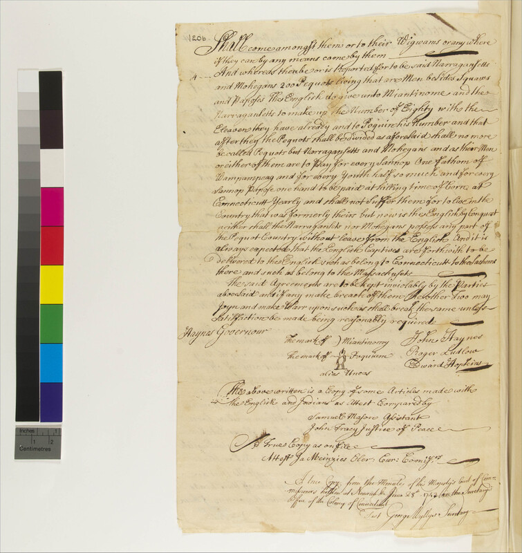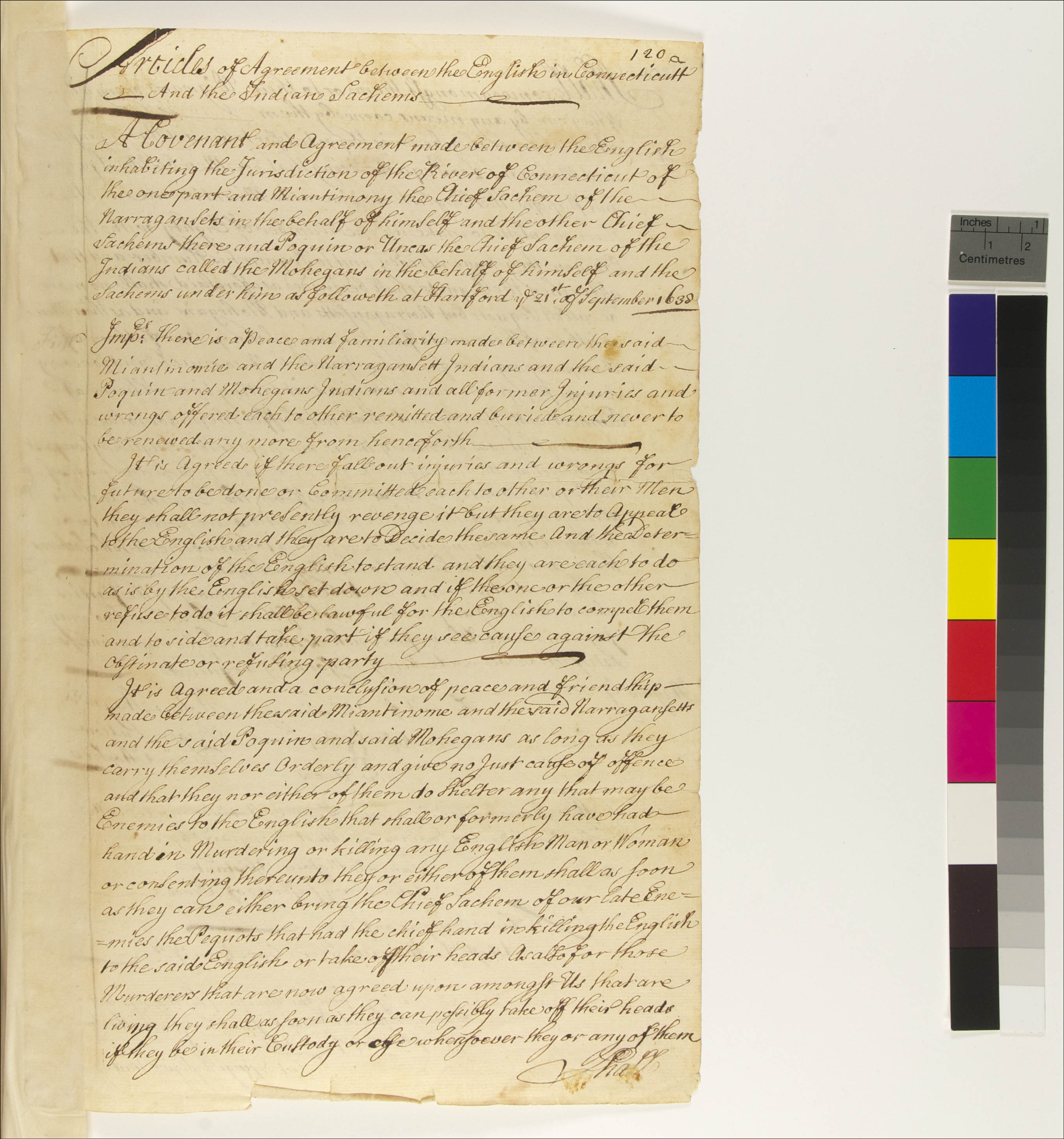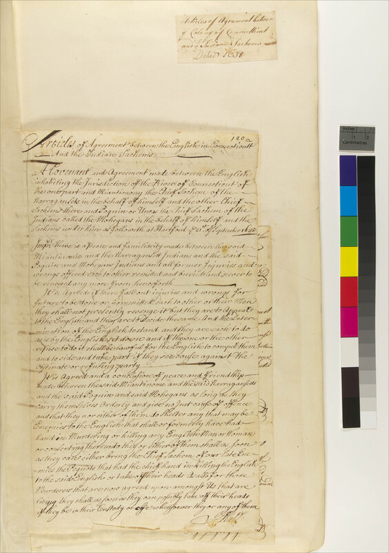 Treaty of Hartford (Copy), September 21, 1638, (1638.09.21.00), Grant-Costa, Paul, et. al., eds., Yale Indian Papers Project, Yale University, http://jake.library.yale.edu:8080/neips/data/html/1638.09.21.00/1638.09.21.00.html.