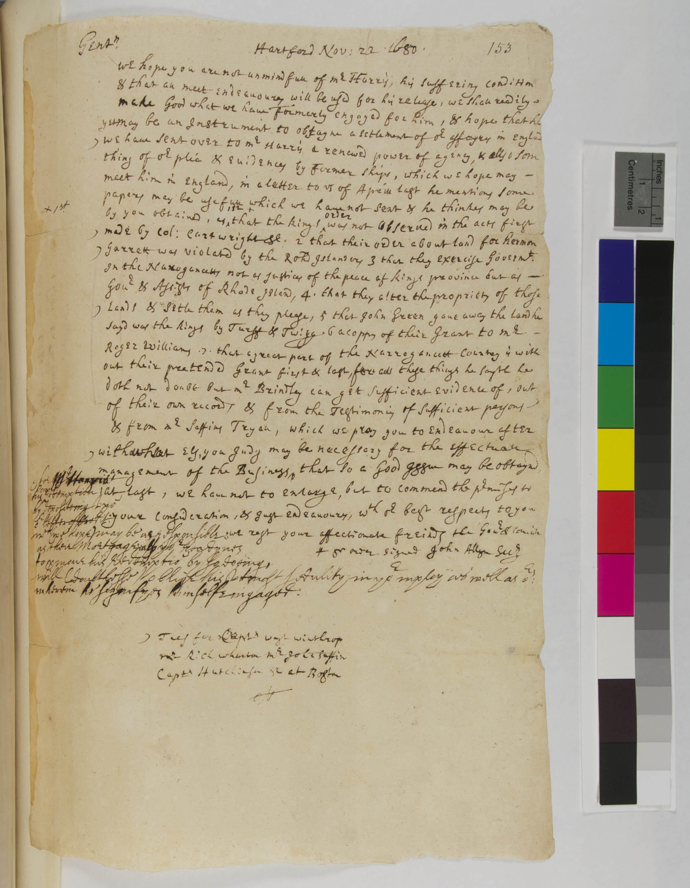 Government -- Colonial -- Colony of Connecticut -- Agents; Government -- Colonial -- Colony of Rhode Island -- Governors; Government -- Colonial -- Colony of Rhode Island -- Justices of the Peace; Government -- Colonial -- Colony of Rhode Island; Government -- Imperial -- Agendas -- Trade/Economy; Land -- Complaints -- Trespass; Land -- Conveyances -- Deed/Title; Land -- Conveyances -- Grants; Law -- Criminal Actions -- Adhering to a Foreign Jurisdiction; Law -- Criminal Actions -- Case Names -- Rex v. John Saffin; Law -- Evidence; Relations -- Colonial Affairs; Relations -- Intercolonial; Relations -- Tribal Affairs; Tribes/Communities -- Narragansett; Tribes/Communities -- Pequot -- Eastern; YIPP -- Colony of Connecticut Collection, 1603-1783; YIPP -- Colony of Rhode Island Collection, 1600-1783