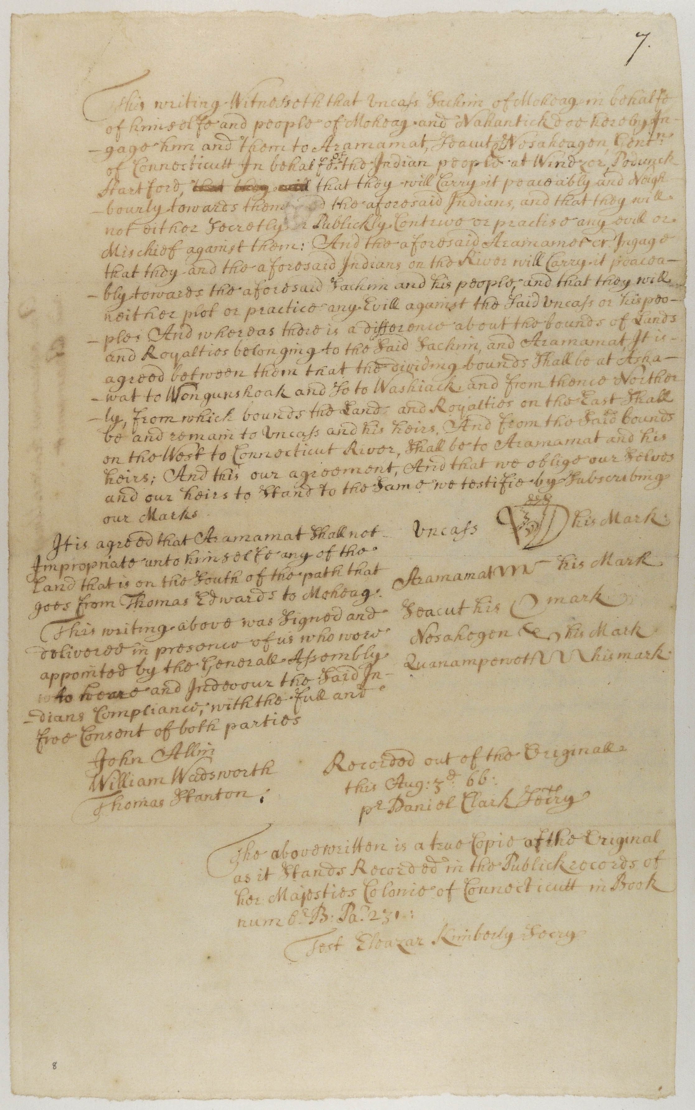 Allyn, John, 1631-1696 (Witness); Arramanet, Robert (Mentioned within document); Clarke, Daniel (Recorder); Edwards, Thomas, 1640-1698 (Mentioned within document); Kimberly, Eleazar, 1639-1709 (Attestor); Nesahegen (Mentioned within document); Seacutt (Mentioned within document); Stanton, Thomas, 1616-1676 (Witness); Uncas, 1590-1683 (Mentioned within document); Unknown (Recipient); Wadsworth, William (Witness)