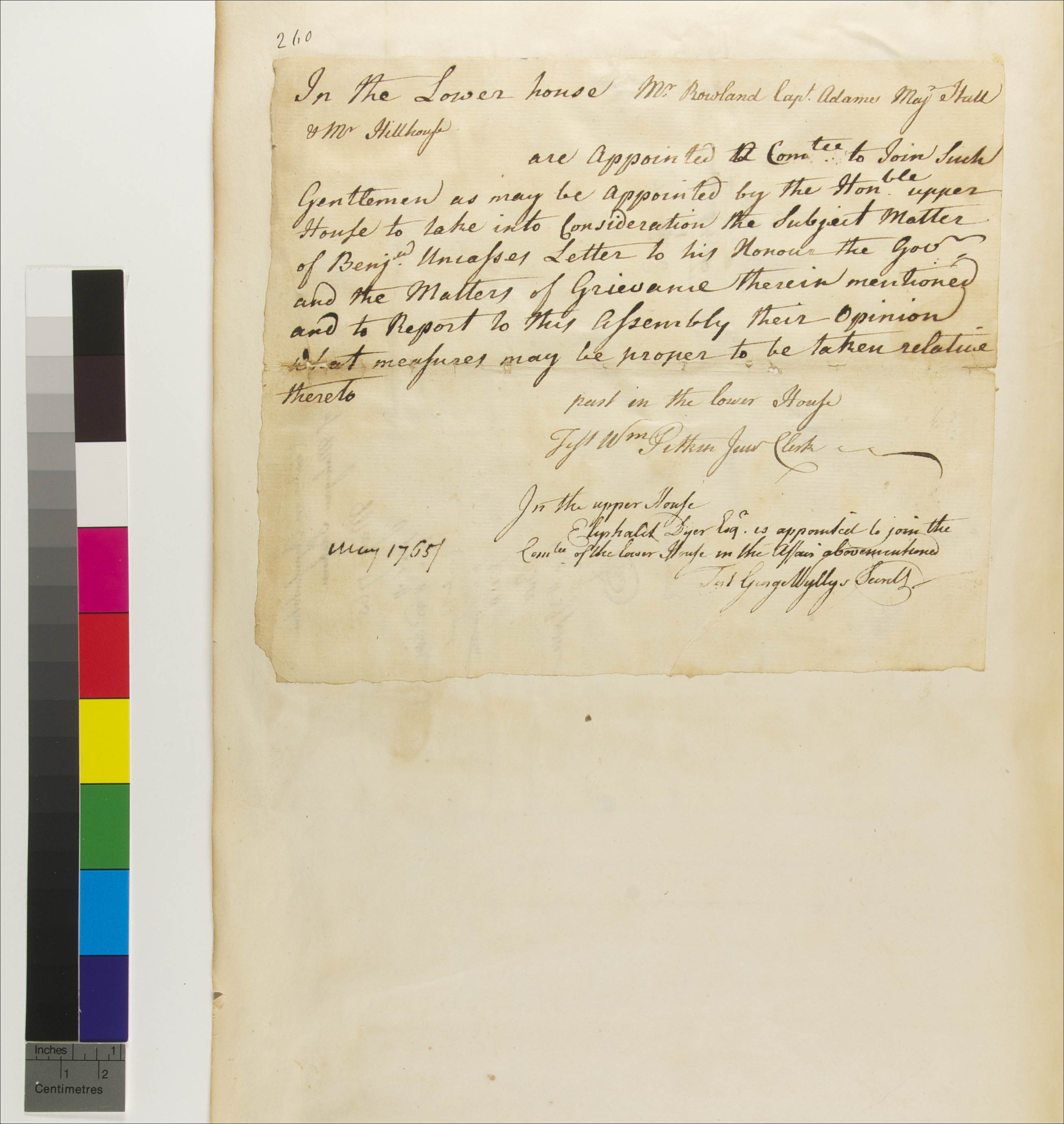Adams, Pygan (Mentioned within document); Dyer, Eliphalet (Attestor); Hall, Elihu (Mentioned within document); Hillhouse, William (Mentioned within document); Pitkin, William, Jr (Attestor); Rowland, David (Mentioned within document); Uncas, Benjamin, -1769 (Mentioned within document); Unknown (Recipient); Wyllys, George, 1710-1796 (Attestor)