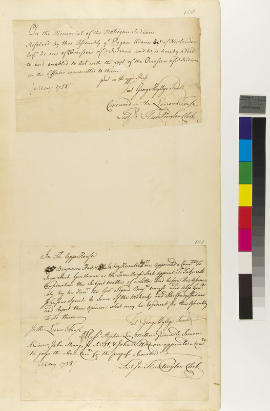 Government -- Colonial -- Colony of Connecticut -- General Assembly -- Committees; Government -- Colonial -- Colony of Connecticut -- General Assembly; Government -- Imperial -- Agencies -- Superintendent of Indian Affairs; Government -- Imperial -- Agendas -- Diplomacy; Government -- Tribal -- Mohawk; Government -- Tribal -- Mohegan -- Pro-Government Faction -- Sachems/Sagamores -- Ben Uncas III (1746-1769); Government -- Tribal -- Stockbridge; Law -- Legislative Process -- Appointment; Relations -- Colonial Affairs; Relations -- Imperial Affairs; Relations -- Tribal Affairs; Tribes/Communities -- Mohawk; Tribes/Communities -- Mohegan; Tribes/Communities -- Stockbridge; YIPP -- Colony of Connecticut Collection, 1603-1783