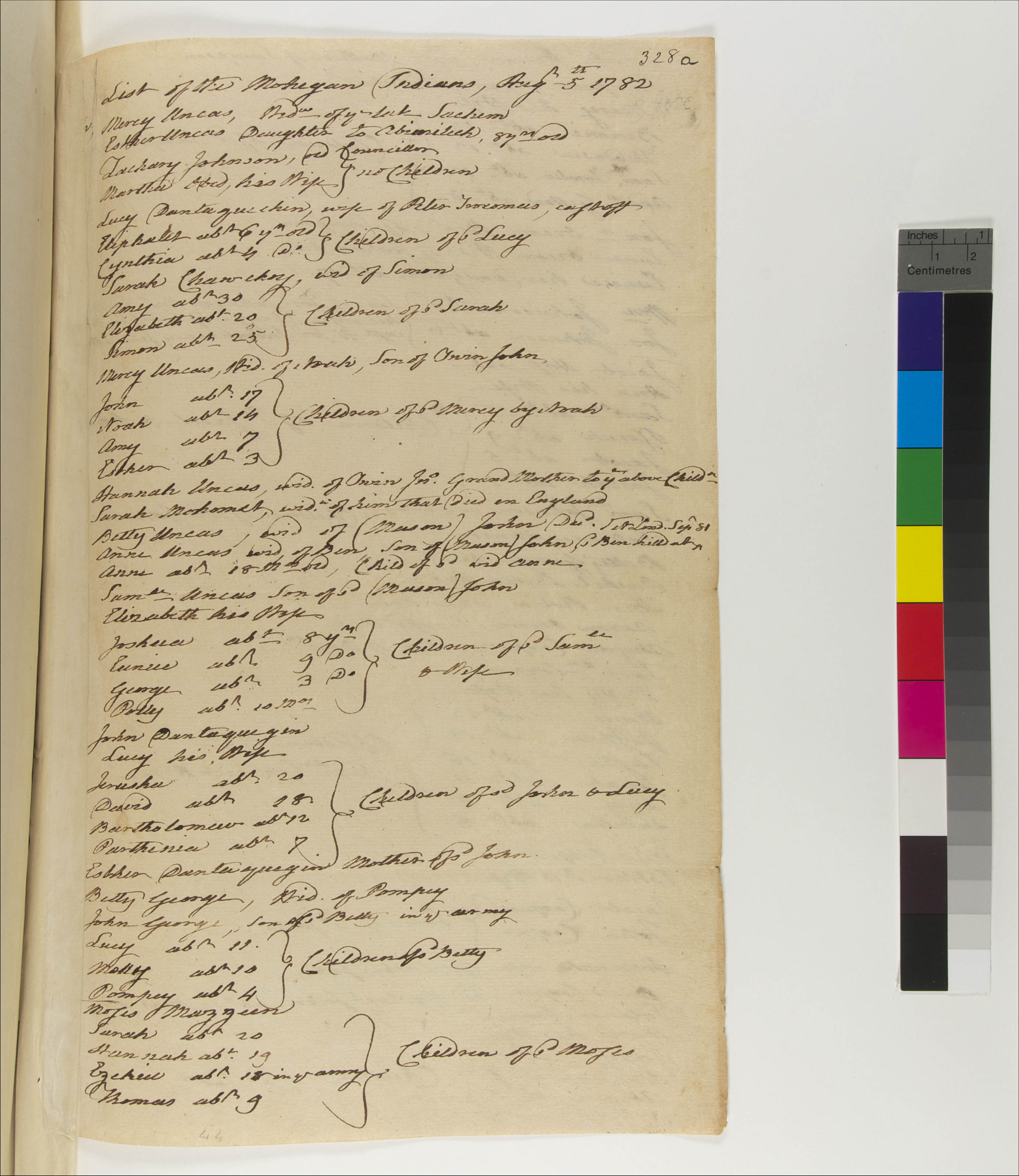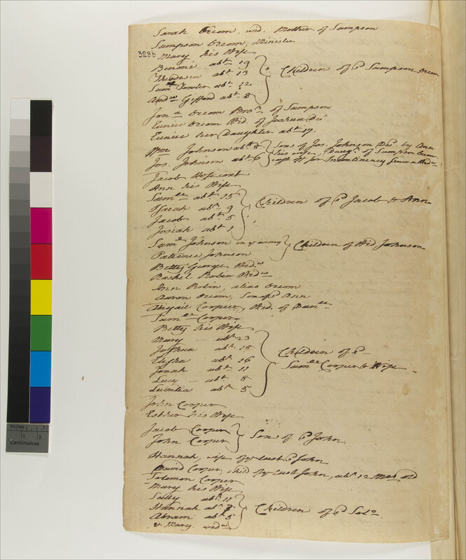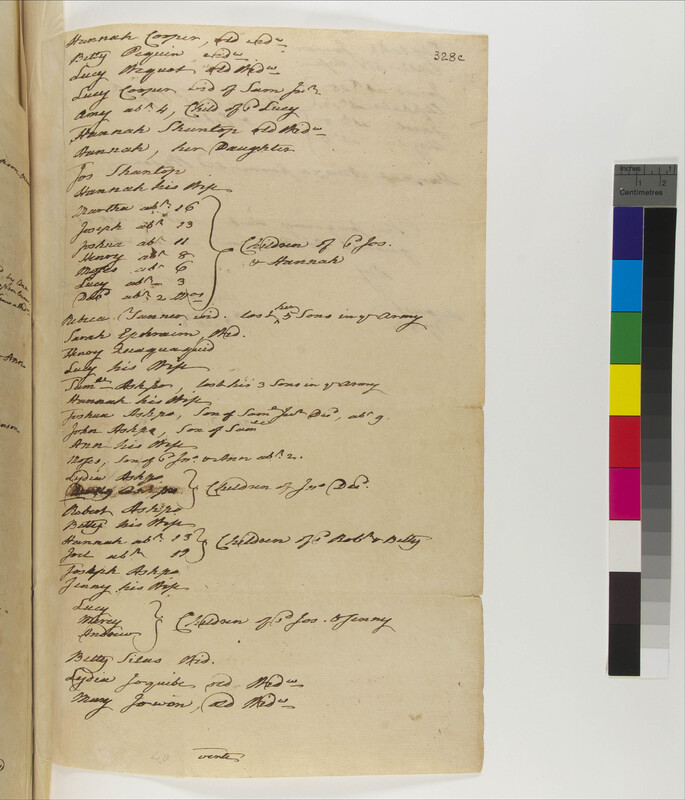 Ashbow Shantup, Hannah (wife of Joseph) (Mentioned within document); Ashbow, Andrew (son of Jos. And Jenny) (Mentioned within document); Ashbow, Ann (wife of John ) (Mentioned within document); Ashbow, Betty (wife of Rob) (Mentioned within document); Ashbow, Hannah (dau. of Rob. And Betty), 1769- (Mentioned within document); Ashbow, Jenny (wife of Joseph) (Mentioned within document); Ashbow, Joel (son of Rob and Betty), 1763- (Mentioned within document); Ashbow, John, 1740- (Mentioned within document); Ashbow, Joseph (hus of Jenny) (Mentioned within document); Ashbow, Joshua (son of Samuel, Jr.), 1773-1797 (Mentioned within document); Ashbow, Lucy (dau. of Jos. And Jenny) (Mentioned within document); Ashbow, Lydia (dau of John) (Mentioned within document); Ashbow, Mercy (dau. Jos. And Jenny) (Mentioned within document); Ashbow, Moses Sone of John and Ann), 1780- (Mentioned within document); Ashbow, Robert (hus of Betty) (Mentioned within document); Ashbow, Samuel, 1718-1795 (Mentioned within document); Ashbow, Samuel, Jr., -1775 (Mentioned within document); Ashbow, Simeon, -1780 (Mentioned within document); Choychoy, Amy, 1752- (Mentioned within document); Choychoy, Elizabeth, 1762- (Mentioned within document); Choychoy, Sarah (Mentioned within document); Choychoy, Simon (Mentioned within document); Choychoy, Simon, 1757- (Mentioned within document); Cooper, Abigail (Mentioned within document); Cooper, Abram (son of Sol and Mary), 1777- (Mentioned within document); Cooper, Betty (wife of Samuel) (Mentioned within document); Cooper, Daniel, -1772 (Mentioned within document); Cooper, David (son of John jr. and hannah), 1781- (Mentioned within document); Cooper, Elisha (son of Sam. and Betty), 1766-1784 (Mentioned within document); Cooper, Esther (wife. Of John) (Mentioned within document); Cooper, Hannah ("Old" in 1769 and 1782) (Mentioned within document); Cooper, Hannah (dau of Sol and Mary), 1775- (Mentioned within document); Cooper, Hannah (wife of John Jr.) (Mentioned within document); Cooper, Jacob (son of John and Esther) (Mentioned within document); Cooper, John (hus. Of Esther) (Mentioned within document); Cooper, John, Jr. (son of John and Esther) (Mentioned within document); Cooper, Jonah (son of Sam. And Betty), 1771- (Mentioned within document); Cooper, Joshua (son of Sam. And Betty), 1764- (Mentioned within document); Cooper, Lucretia (dau. of Sam and Betty), 1777- (Mentioned within document); Cooper, Lucy (dau. of Sam. And Betty), 1774- (Mentioned within document); Cooper, Lucy (wid. Of Sam. Jr.) (Mentioned within document); Cooper, Mary (Child of Sam and Betty), 1759- (Mentioned within document); Cooper, Mary (dau of Sol and Mary) (Mentioned within document); Cooper, Mary (wife of Solomon) (Mentioned within document); Cooper, Sally (dau of Sol and Mary), 1771- (Mentioned within document); Cooper, Samuel (hus. Of Betty) (Mentioned within document); Cooper, Samuel, Jr (son of Sam and betty) (Mentioned within document); Cooper, Solomon (hus. Of Mary) (Mentioned within document); George, Betty (wife of Pompy) (Mentioned within document); George, John (son of Pompey and betty) (Mentioned within document); George, Lucy (dau. Pompey and Betty), 1771- (Mentioned within document); George, Molly (dau. of Pompey and Betty), 1772- (Mentioned within document); George, Pomp, Jr. (son of Pompey and betty), 1778- (Mentioned within document); George, Pompey (hus. Of betty) (Mentioned within document); Horsecoat, Ann (wife of Jacob) (Mentioned within document); Horsecoat, Isaiah, 1773- (Mentioned within document); Horsecoat, Jacob, Jr. (hus. of Ann) (Mentioned within document); Horsecoat, Josiah, 1781- (Mentioned within document); Horsecoat, Samuel, 1767- (Mentioned within document); Johnson, Joseph, 1752-1776 (Mentioned within document); Johnson, Joseph, 1776- (Mentioned within document); Johnson, Patience (Child in 1769) (Mentioned within document); Johnson, Samuel (mohegan) (Mentioned within document); Johnson, Widow (Mentioned within document); Johnson, William, 1774- (Mentioned within document); Johnson, Zachary, 1687-1787 (Mentioned within document); Joquib, Lydia (Mentioned within document); Jowon, Eliphalet (hus of Esther) (Mentioned within document); Jowon, Eliphalet, Jr. (son of Eliph and Esther), 1770- (Mentioned within document); Jowon, Esther (wife of Eliph) (Mentioned within document); Jowon, Hezekiah (son of Eliph and Esther), 1778- (Mentioned within document); Jowon, Jacob (son of Eliph and Esther), 1774- (Mentioned within document); Jowon, Jonas (son of Eliphaletand Esther), 1764- (Mentioned within document); Jowon, Mary (Mentioned within document); Mahomet, Sarah (Mentioned within document); Mamnack Ashbow, Hannah, -1801 (Mentioned within document); Meazon, Ezekiel (son of Moses), 1764- (Mentioned within document); Meazon, Hannah (dau. of Moses), 1763- (Mentioned within document); Meazon, Moses (Mentioned within document); Meazon, Sarah (dau. of Moses), 1762- (Mentioned within document); Meazon, Thomas (son of Moses), 1773- (Mentioned within document); Nannapoom, Hannah (Mentioned within document); Obed, Martha (Mentioned within document); Occom Johnson, Tabitha, 1754- (Mentioned within document); Occom Tantaquidgeon, Lucy (wife to John), 1731-1830 (Mentioned within document); Occom, Aaron (son of Aaron and Ann) (Mentioned within document); Occom, Aaron, 1753-1771 (Mentioned within document); Occom, Andrew, 1774- (Mentioned within document); Occom, Benoni, 1763-1829 (Mentioned within document); Occom, Eunice (dau. of Joshua and Eunice), 1765-1787 (Mentioned within document); Occom, Eunice (wife of Joshua), -1809 (Mentioned within document); Occom, Jonathan, 1725- (Mentioned within document); Occom, Joshua (hus. of Eunice) (Mentioned within document); Occom, Lemuel, 1771-1790 (Mentioned within document); Occom, Samson, 1723-1792 (Mentioned within document); Occom, Sarah (wife of Joshua), 1690- (Mentioned within document); Occom, Theodosia, 1769- (Mentioned within document); 