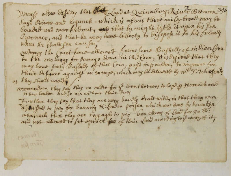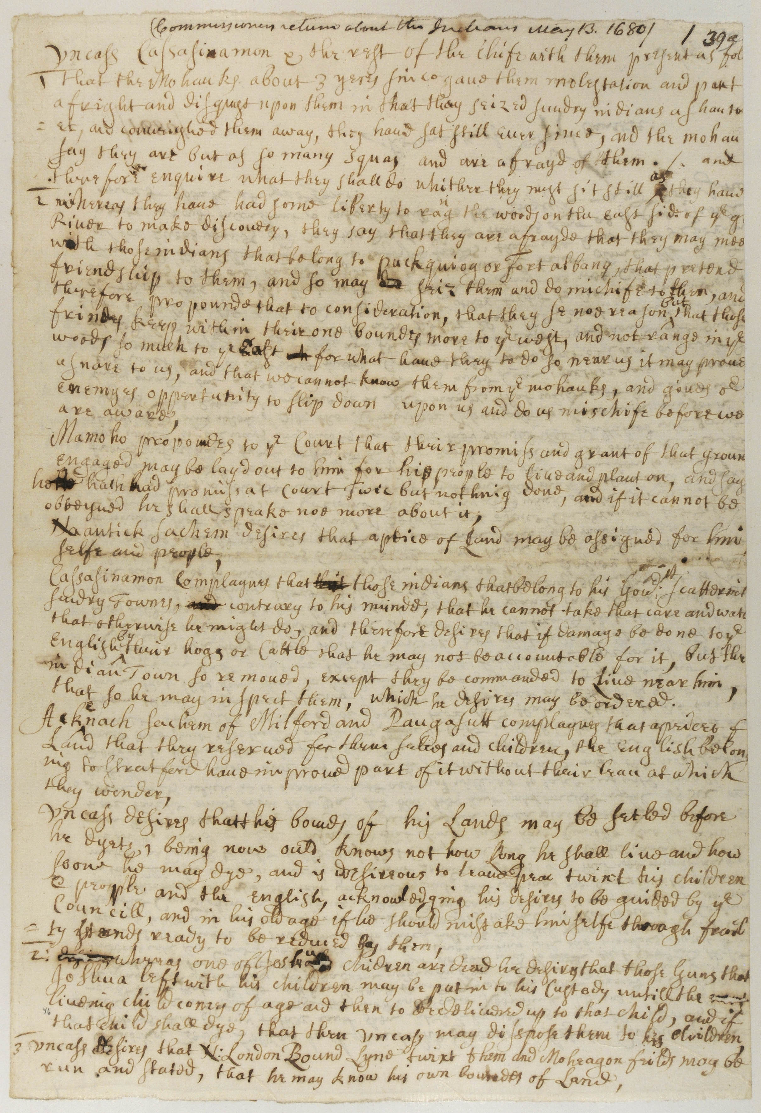 Buildings/Structures -- Forts; Buildings/Structures -- Prisons; Culture -- Alcohol Consumption; Culture -- Clothing/Dress; Culture -- Elders; Culture -- Family; Culture -- Genealogy; Culture -- Inheritance; Culture -- Tribute; Food/Drink -- Corn/Yokeag; Government -- Colonial -- Colony of Connecticut -- General Assembly; Government -- Tribal -- Mohegan -- Sachems/Sagamores -- Owaneco (1683-1715); Government -- Tribal -- Mohegan -- Sachems/Sagamores -- Uncas (1638-1683); Government -- Tribal -- Niantic -- Western; Government -- Tribal -- Paugusset; Government -- Tribal -- Pequot -- Eastern -- Sachems/Sagamores -- Mamoho (c.1675-1694); Government -- Tribal -- Pequot -- Western -- Sachems/Sagamores -- Robin Cassasinamon I (1647-1692); Land -- Complaints -- Encroachment -- Animal; Land -- Complaints -- Encroachment -- Neighbors; Land -- Complaints -- Encroachment; Land -- Complaints -- Trespass; Land -- Complaints; Land -- Conveyances -- Sale; Land -- Description -- Boundaries; Land -- Reservation/Reserve -- Mohegan; Land -- Reservation/Reserve -- Niantic -- Western; Land -- Reservation/Reserve -- Pequot -- Eastern; Land -- Reservation/Reserve -- Pequot -- Western; Land -- Use -- Improvement -- Agriculture -- Damage to; Land -- Use -- Improvement -- Agriculture; Landforms -- Aquatic -- Rivers -- Connecticut; Landforms -- Terrestrial -- Forests; Law -- Criminal Actions -- Felonies -- Arson; Military -- Arms/Ammunition; Military -- Forts -- Fort Albany; Military -- Indian Conspiracies; Relations -- Colonial Affairs; Relations -- Inter-Tribal Affairs -- Alliance; Relations -- Inter-Tribal Affairs -- Violence; Relations -- Tribal Affairs; Tribes/Communities -- Fort Albany Indians; Tribes/Communities -- Milford Indians; Tribes/Communities -- Mohawk; Tribes/Communities -- Mohegan -- Shetucket Indians; Tribes/Communities -- Mohegan; Tribes/Communities -- Niantic -- Western; Tribes/Communities -- Nipmuc; Tribes/Communities -- Pequot -- Eastern; Tribes/Communities -- Pequot -- Western; Tribes/Communities -- Puckquiog; Tribes/Communities -- Western Indians; Vital Records -- Deaths; YIPP -- Colony of Connecticut Collection, 1603-1783