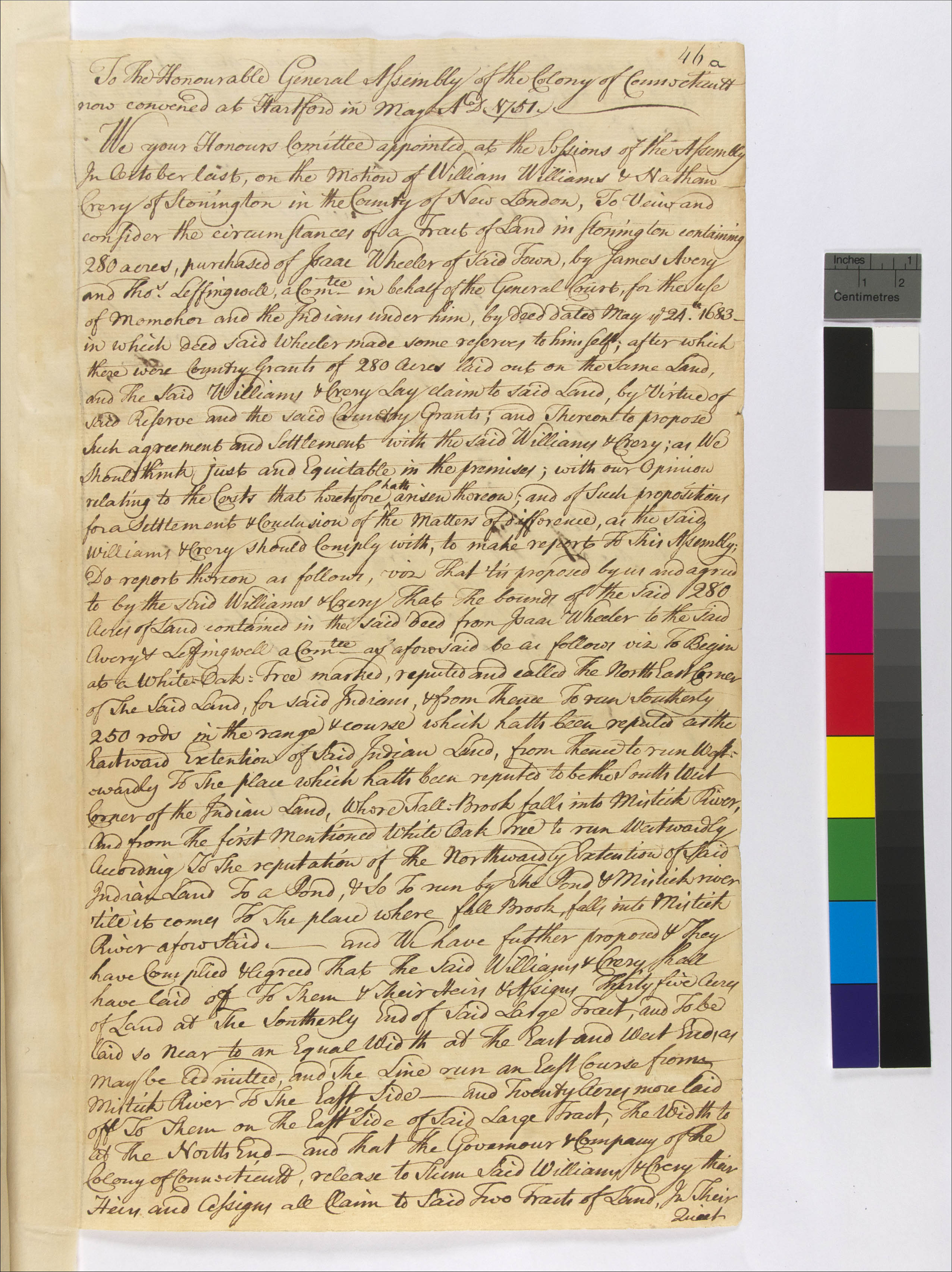 Avery, James, 1620-1700 (Mentioned within document); Connecticut General Assembly (Recipient); Crary, Nathan, 1717-1798 (Mentioned within document); Dyer, John (Mentioned within document); Fowler, John, 1690-1756 (Attestor); Huntington, Isaac (Mentioned within document); Leffingwell, Thomas, 1624-1714 (Mentioned within document); Mamoho (Mentioned within document); Trumbull, Jonathan (Mentioned within document); Wheeler, Isaac, 1646-1712 (Mentioned within document); Williams, William, 1731-1811 (Mentioned within document)