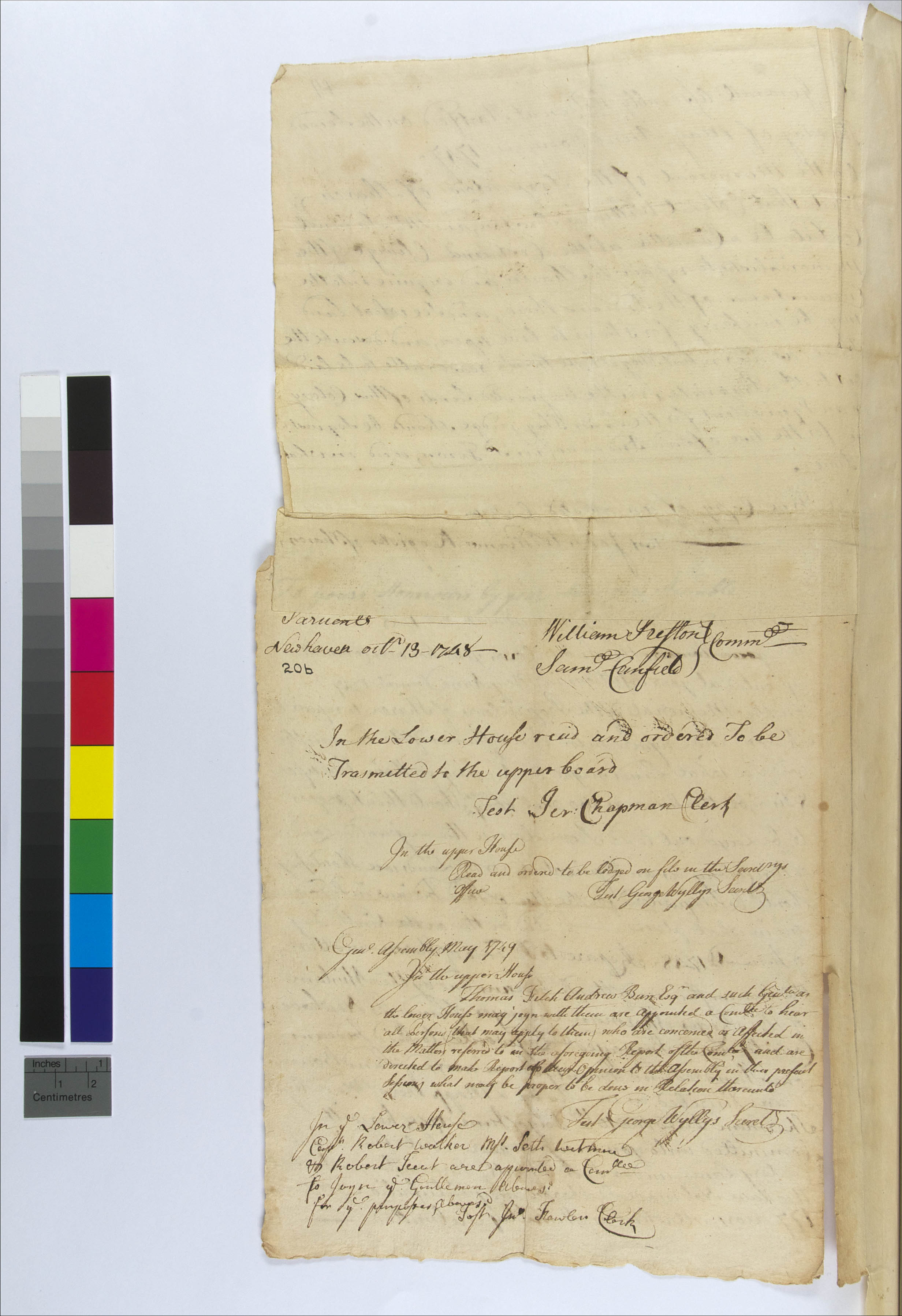 Burr, Andrew (Mentioned within document); Chapman, Jeremiah (Attestor); Connecticut General Assembly (Recipient); Fitch, Thomas (Mentioned within document); Fowler, John, 1690-1756 (Attestor); Sherman, Roger (Mentioned within document); Treat, Robert (Mentioned within document); Walker, Robert (Mentioned within document); Wetmore, Seth (Mentioned within document); Wyllys, George, 1710-1796 (Attestor)