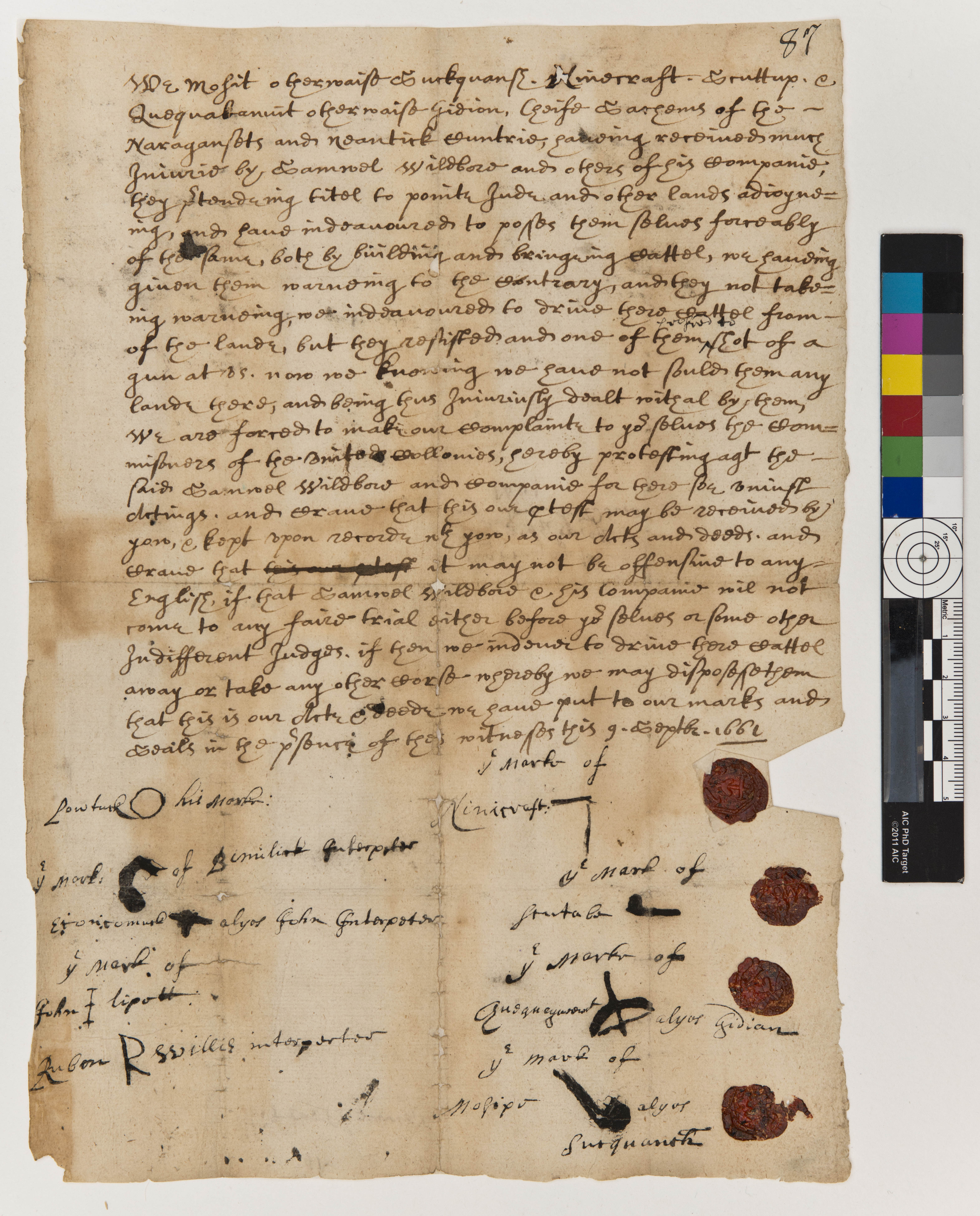Animals -- Cattle; Government -- Colonial -- United Colonies -- Commissioners; Government -- Tribal -- Narragansett -- Sachems/Sagamores -- Ninigret (1637-1677); Government -- Tribal -- Niantic -- Eastern; Land -- Complaints -- Ejectment; Land -- Complaints -- Encroachment; Land -- Complaints -- Trespass; Land -- Conveyances -- Deed/Title; Land -- Use -- Improvement -- Husbandry/Livestock; Language -- Interpreter; Law -- Criminal Actions -- Felonies -- Assault; Law -- Legislative Process -- Petitions; Relations -- Colonial Affairs; Relations -- Tribal Affairs; Relations -- Violence; Tool/Weapon -- Guns; Tribes/Communities -- Narragansett; Tribes/Communities -- Niantic -- Eastern