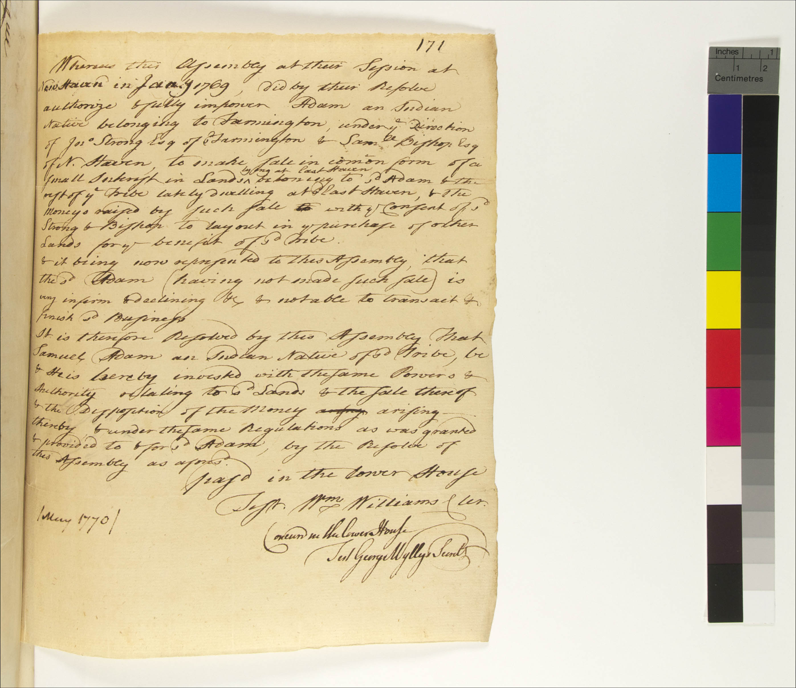 Adam (Quinnipiac) (Mentioned within document); Adams, Samuel (Tunxis) (Mentioned within document); Bishop, Samuel (Mentioned within document); Strong, Joseph (Mentioned within document); Unknown (Recipient); Williams, William, 1731-1811 (Attestor); Wyllys, George, 1710-1796 (Attestor)