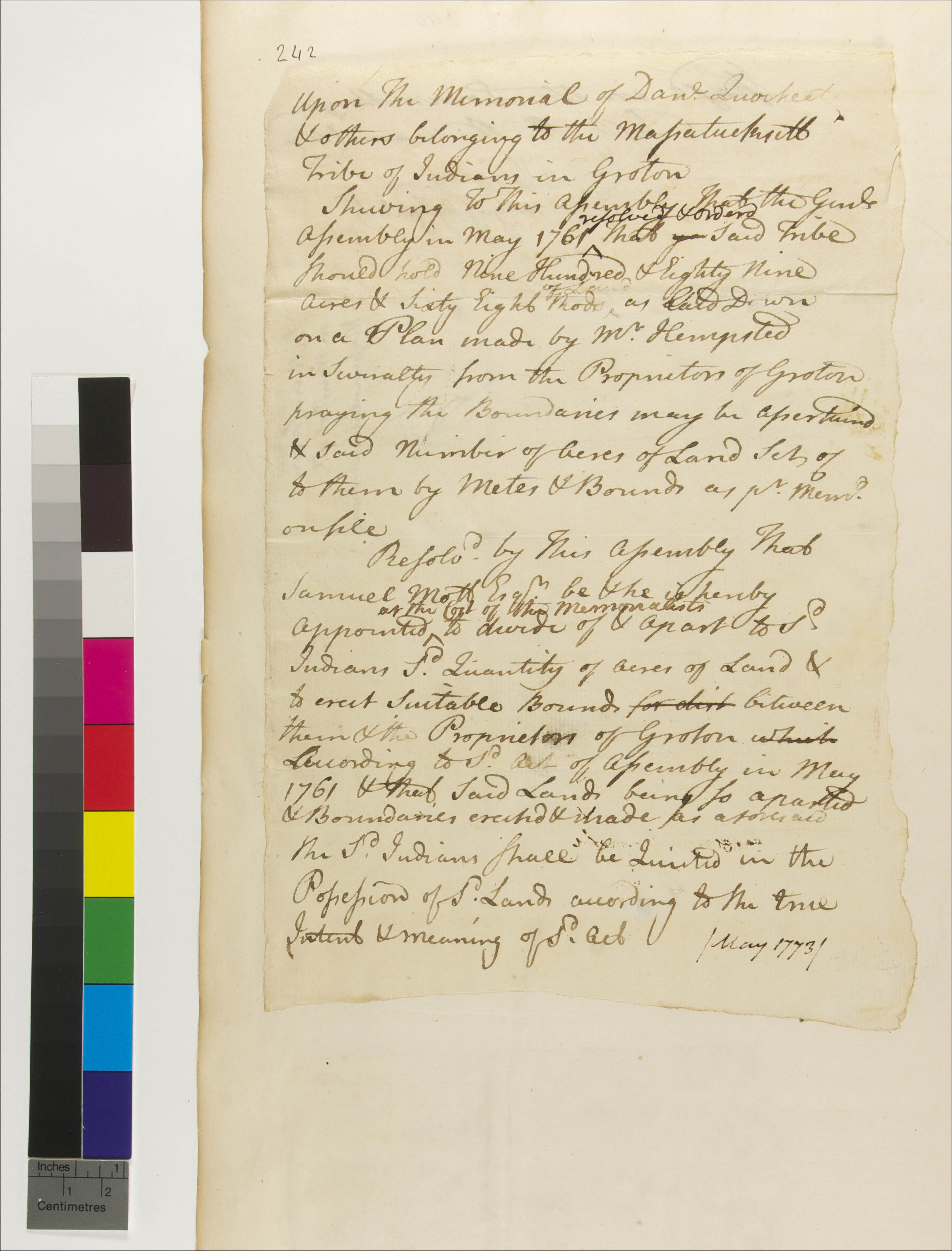 Government -- Colonial -- Colony of Connecticut -- General Assembly -- Committees; Government -- Colonial -- Colony of Connecticut -- General Assembly; Government -- Tribal -- Pequot -- Western -- Sachems/Sagamores -- Daniel Quocheats (c.1760-1774); Land -- Common -- Division; Land -- Complaints -- Investigation; Land -- Description -- Boundaries; Land -- Map/Survey; Land -- Reservation/Reserve -- Pequot -- Western; Land; Law -- Legislative Process -- Acts/Resolves; Relations -- African American Affairs; Relations -- Colonial Affairs; Relations -- Tribal Affairs; Tribes/Communities -- Pequot -- Mystic Indians; YIPP -- Colony of Connecticut Collection, 1603-1783
