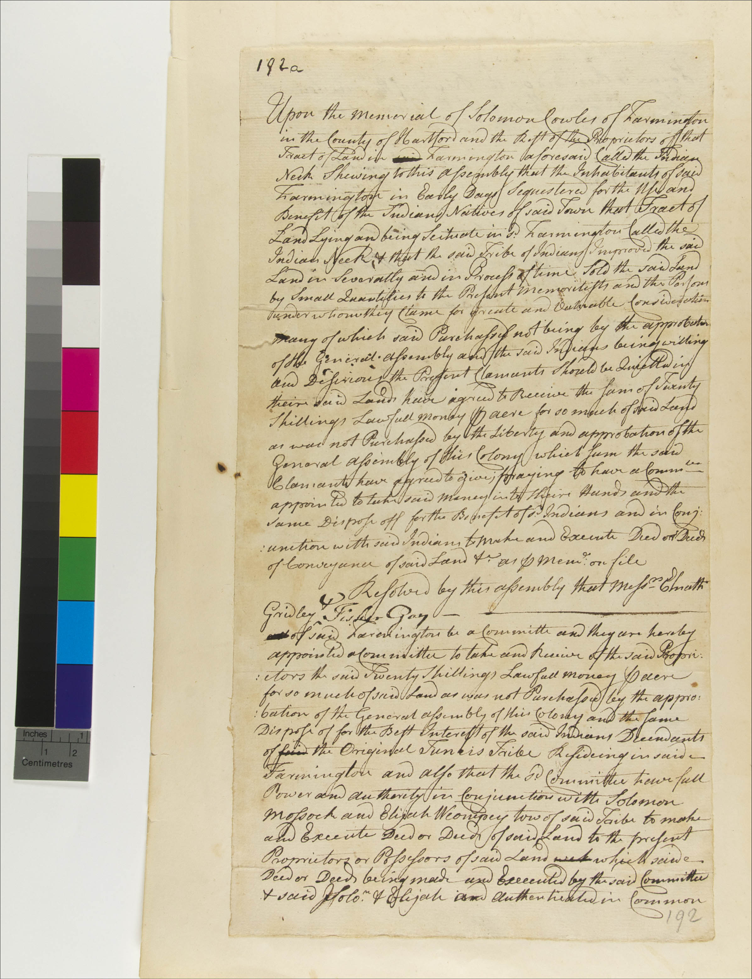 Education/Schools -- Literacy; Government -- Colonial -- Colony of Connecticut -- General Assembly -- Committees; Government -- Colonial -- Colony of Connecticut -- General Assembly; Government -- Tribal -- Tunxis; Land -- Common -- Division; Land -- Conveyances -- Sale -- Request; Land -- Conveyances -- Sale; Land -- Reservation/Reserve -- Tunxis; Land -- Use -- Improvement; Law -- Legislative Process -- Acts/Resolves -- Accepted; Law -- Property; Relations -- Colonial Affairs; Relations -- Tribal Affairs; Tribes/Communities -- Tunxis; YIPP -- Colony of Connecticut Collection, 1603-1783