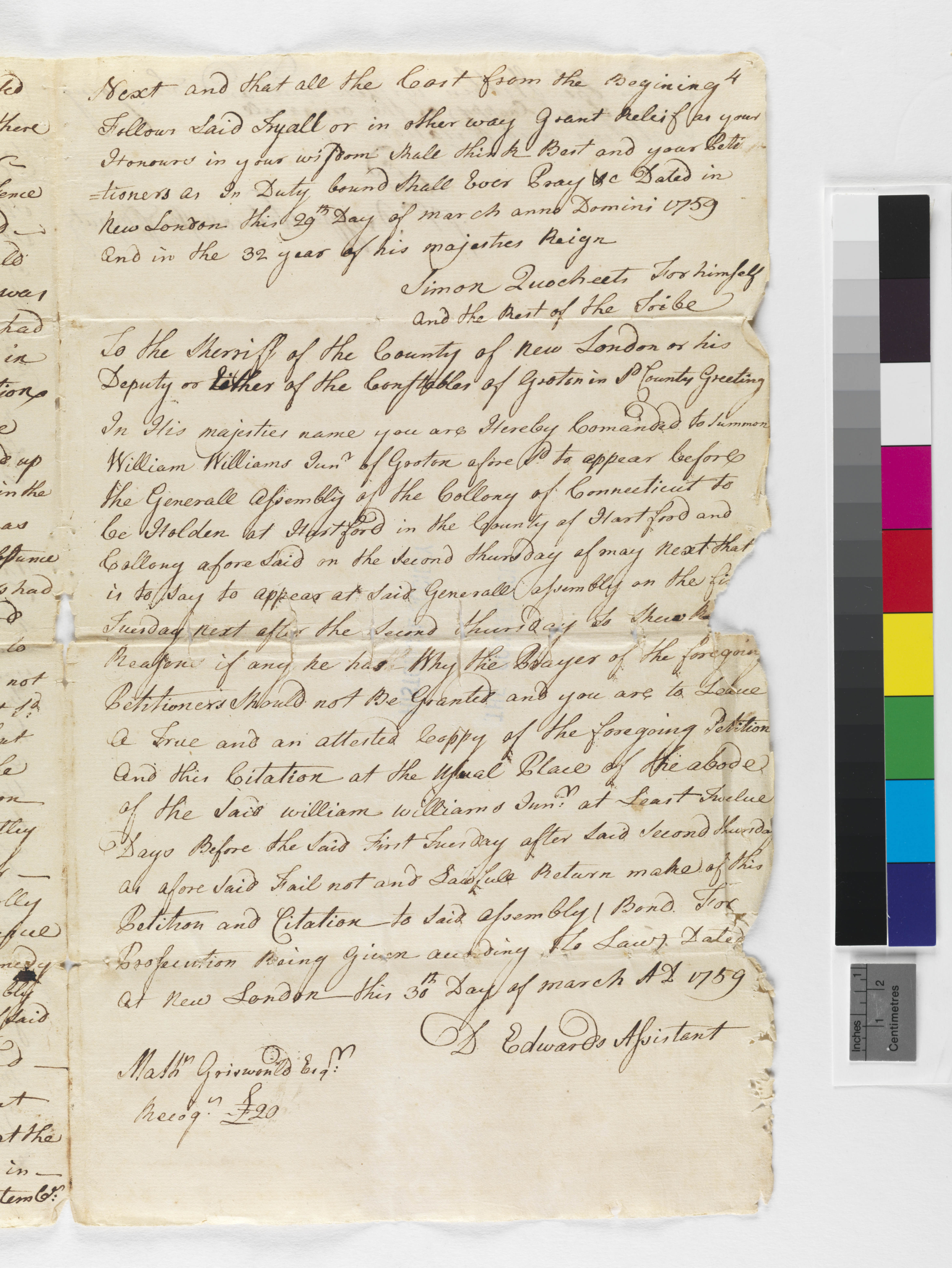Copy of Petition and Citation from the Case of Pequot Indians vs. William Williams, Jr., May 1759, (1759.05.00.01), Grant-Costa, Paul, and Tobias Glaza, eds., Yale Indian Papers Project, Yale University, http://jake.library.yale.edu:8080/neips/data/html/1759.05.00.01/1759.05.00.01.html.