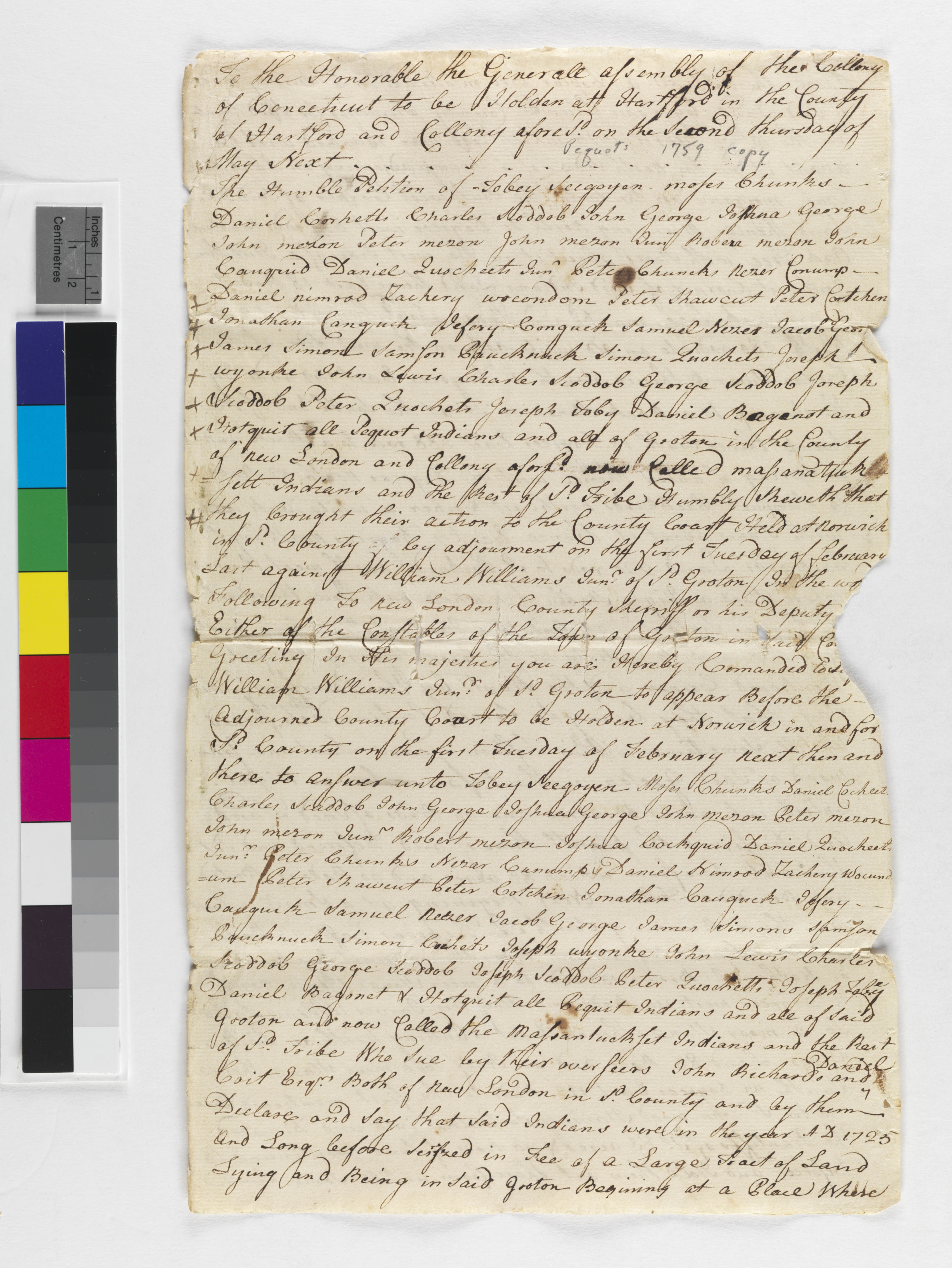Allen, James (Mentioned within document); Bagnet, Daniel, -1762 (Mentioned within document); Brown, Nathaniel (Mentioned within document); Canquick, Jefferey (Mentioned within document); Caujauck, Jonathan (Mentioned within document); Cauquid, John (Mentioned within document); Chonks, Moses (Mentioned within document); Chonks, Peter (Mentioned within document); Coit, Daniel (Mentioned within document); Connecticut General Assembly (Recipient); Conump, Nezer (Mentioned within document); Cotchen, Peter (Mentioned within document); Dyer (Mentioned within document); Edwards, Daniel (Mentioned within document); Elderkin (Mentioned within document); George, Jacob, -1776 (Mentioned within document); George, John (Mentioned within document); George, Joshua (Mentioned within document); Grey, Philip (Mentioned within document); Griswold, Matthew (Mentioned within document); Hotquit (Mentioned within document); Huntington, Jabez (Mentioned within document); Leffingwell, Jonathan (Witness); Lewis, John (Pequot) (Mentioned within document); Meazon, John (Mentioned within document); Meazon, John, Jr (Mentioned within document); Meazon, Peter (Mentioned within document); Meazon, Robin (Mentioned within document); Nezer, Samuel (Mentioned within document); Nimrod, Daniel (Mentioned within document); Packer, Samuel (Mentioned within document); Pauquenup, Samson (Mentioned within document); Plumb, John (Mentioned within document); Quocheats, Daniel (Mentioned within document); Quocheats, Daniel, Jr (Mentioned within document); Quocheats, Peter (Mentioned within document); Quocheats, Simon (Mentioned within document); Richards, John (Mentioned within document); Scadoab, Charles (Mentioned within document); Scadoab, Charles, Jr (Mentioned within document); Scadoab, George (Mentioned within document); Scadoab, Joseph (Mentioned within document); Seegoyen, Toby (Mentioned within document); Shockeat, Peter (Mentioned within document); Simon, James (Mentioned within document); Toby, Joseph (Mentioned within document); Wackwondam, Zachariah (Mentioned within document); Wetmore, Prosper (Attestor); Williams, William, Jr (Mentioned within document); Wood, John (Witness); Wyoke, Joseph (Mentioned within document)