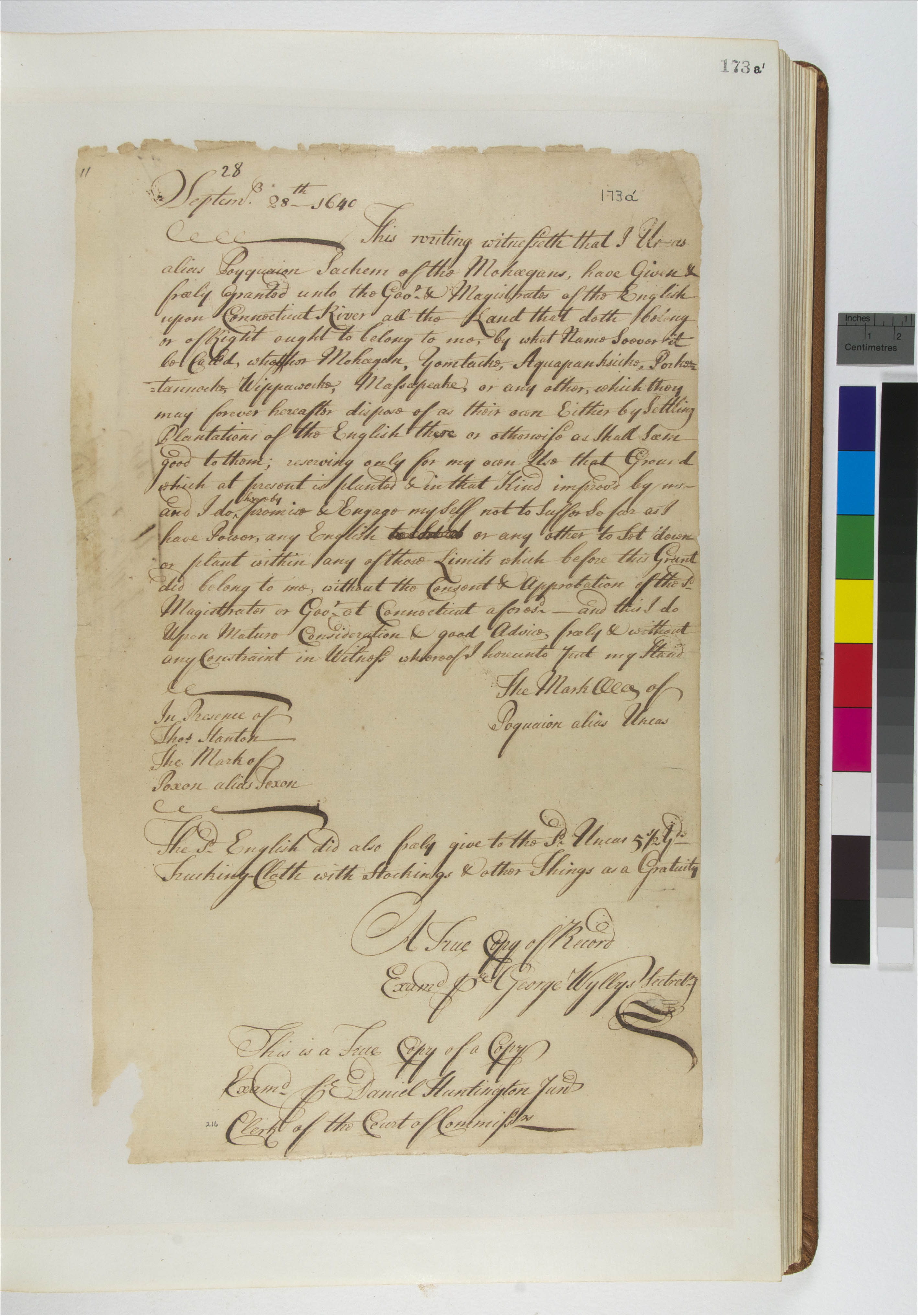 Huntington, Daniel (Witness); Poxon (Witness); Stanton, Thomas, 1616-1676 (Witness); Uncas, 1590-1683 (Mentioned within document); Unknown (Recipient); Wyllys, George, 1710-1796 (Attestor)