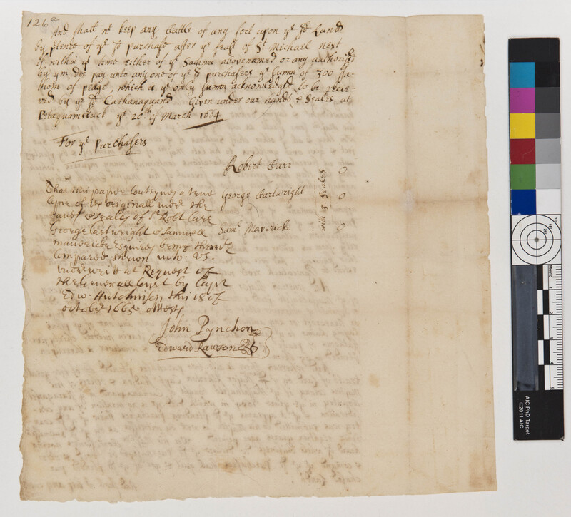 Abstract Ideas -- Royal Protection; Abstract Ideas -- Sovereignty; Animals -- Cattle; Culture -- Wampum; Government -- Colonial -- Massachusetts Bay Colony; Government -- Imperial -- Agencies -- King's Commissioners; Government -- Imperial -- Monarchs:: -- Charles Stuart I (1625-1649); Government -- Imperial -- Monarchs:: -- Charles Stuart II (1660-1685); Government -- Tribal -- Narragansett; Land -- Complaints -- Controversies -- Atherton Land Company; Land -- Conveyances -- Deed/Title; Land -- Conveyances -- Mortgage; Law -- Diplomacy; Military -- Forts; Relations -- Colonial Affairs; Relations -- Imperial Affairs; Relations -- Tribal Affairs; Tribes/Communities -- Narragansett; Tribes/Communities -- Niantic -- Eastern; YIPP -- Colony of Connecticut Collection, 1603-1783