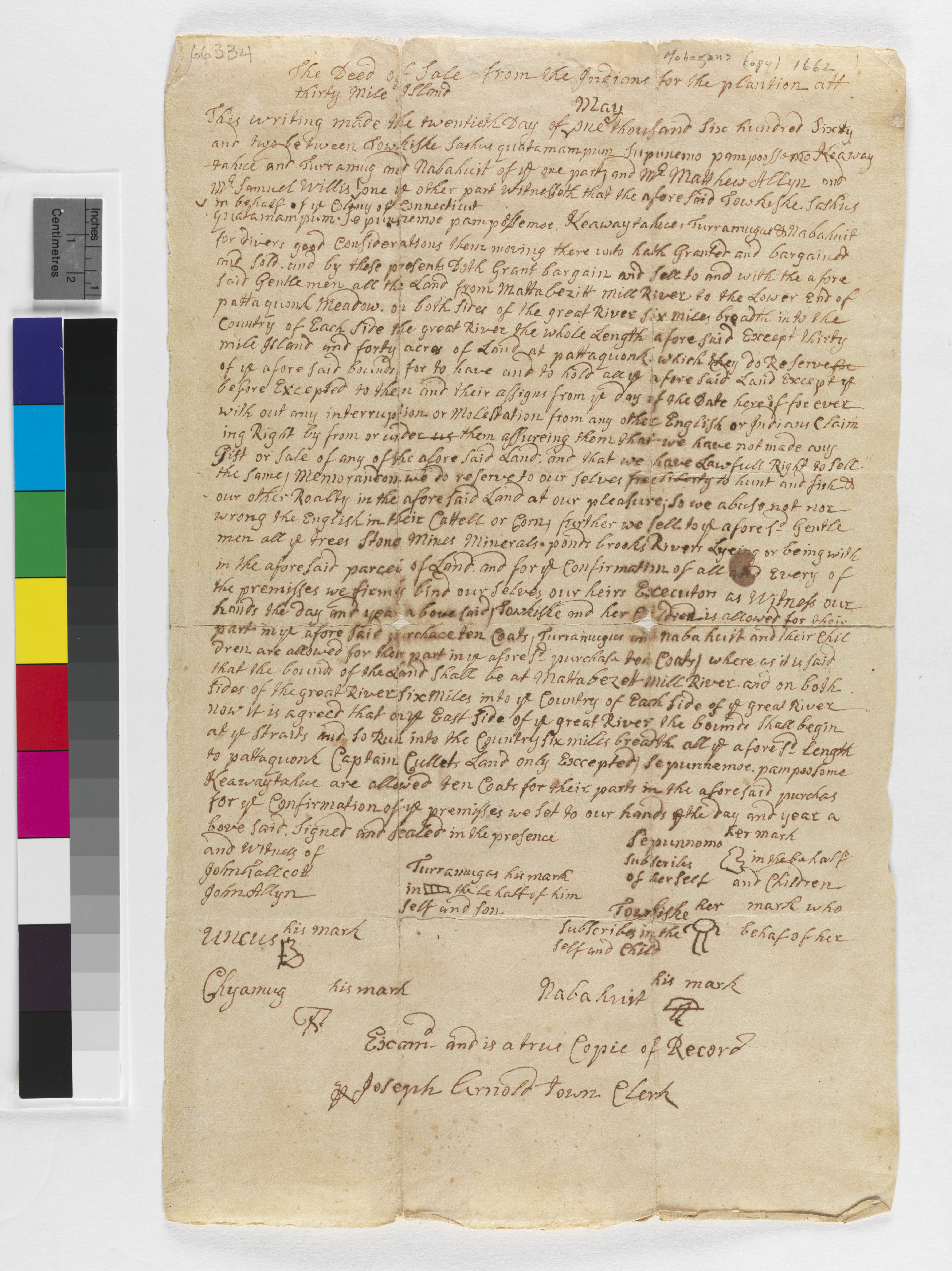 Deed of Sale from the Indians from the Plantation at Thirty Mile Island, May 20, 1662, (1662.05.20.00), Grant-Costa, Paul, and Tobias Glaza, eds., Yale Indian Papers Project, Yale University, http://jake.library.yale.edu:8080/neips/data/html/1662.05.20.00/1662.05.20.00.html.