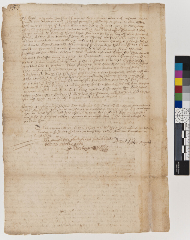 Buildings/Structures -- Wigwams; Culture -- Adultery; Culture -- Disputes; Culture -- Divorce; Culture -- Family; Culture -- Language -- interpreter; Genealogy; Government -- Colonial -- Massachusetts Bay Colony -- Governors; Landforms -- Aquatic -- Swamps; Law -- Civil Actions -- Family Relations -- Divorce; Law -- Criminal Actions -- Evidence/Testimony -- Confession; Law -- Customary Indian Law -- Family Relations; Law -- Evidence; Law -- Imprisonment; Relations -- Inter-Tribal Affairs; Relations -- Tribal Affairs; Religion/Beliefs -- Christianity; YIPP -- Colony of Connecticut Collection, 1603-1783; YIPP -- Massachusetts Bay Colony Collection, 1628-1684