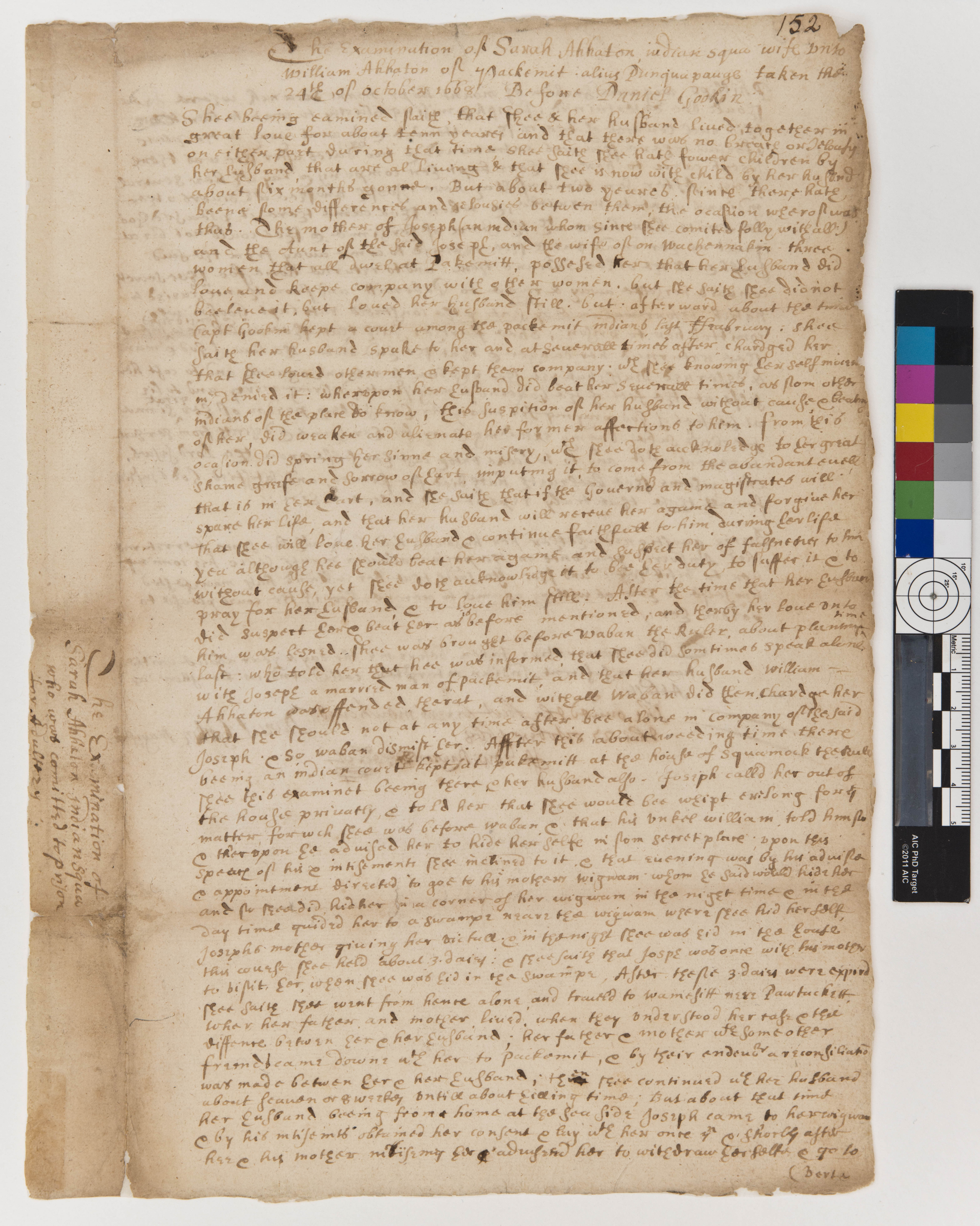 Examination of Sarah Ahaton, October 24, 1668, (1668.10.24.00), Grant-Costa, Paul, et. al., eds., Yale Indian Papers Project, Yale University, http://jake.library.yale.edu:8080/neips/data/html/1668.10.24.00/1668.10.24.00.html.