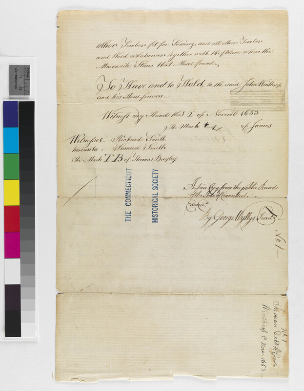 Bailey, Thomas (Witness); Moas (Mentioned within document); Smith, Richard, 1596-1666 (Witness); Smith, Samuel (Witness); Winthrop, John (Gov. MA), 1588-1649 (Mentioned within document); Winthrop, John, Jr. (Gov. CT), 1606-1676 (Recipient); Wyllys, George, 1710-1796 (Attestor)