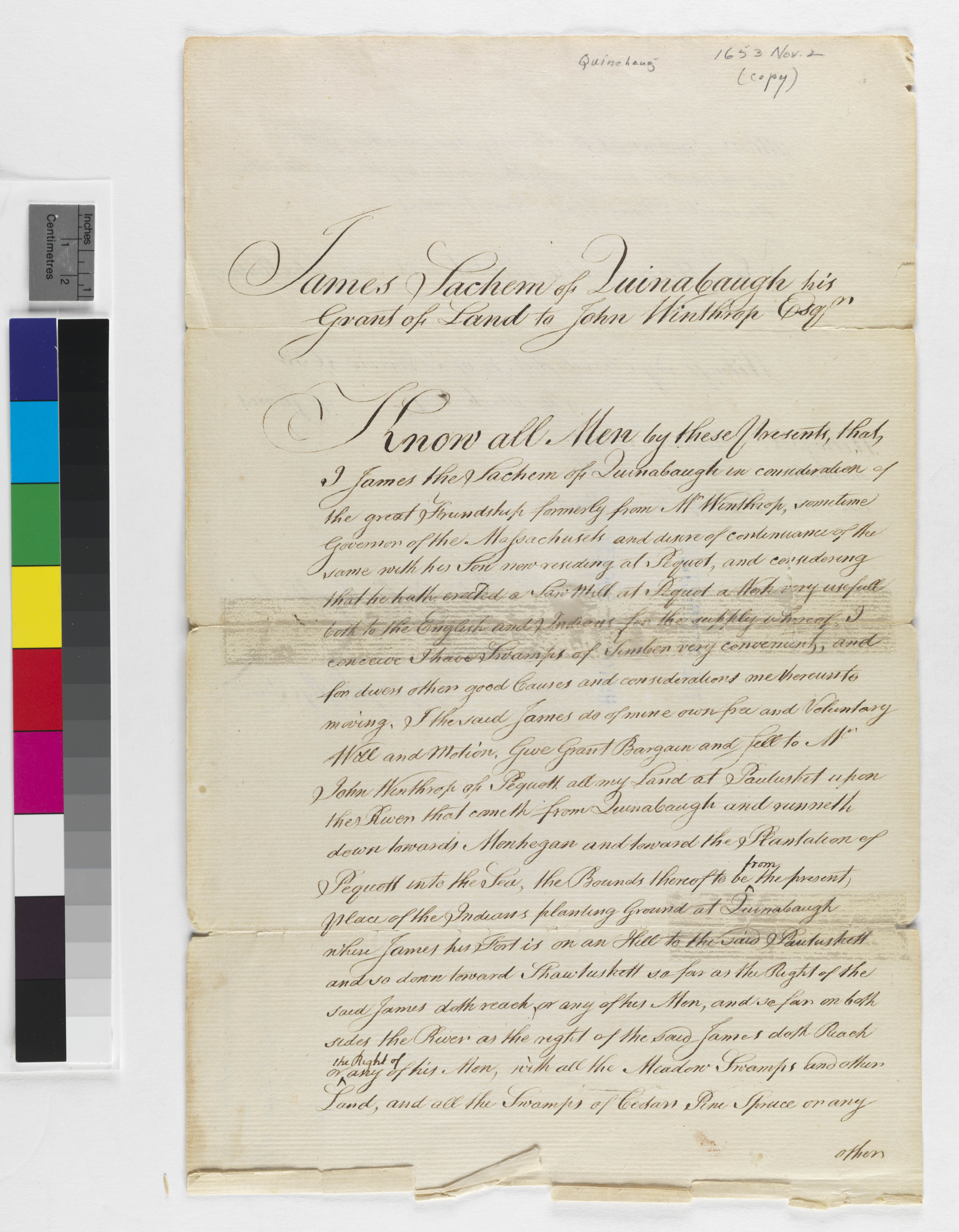Grant of Land from James, Sachem of Quinnebaug, to John Winthrop, November 2, 1653, (1653.11.02.01), Grant-Costa, Paul, and Tobias Glaza, eds., Yale Indian Papers Project, Yale University, http://jake.library.yale.edu:8080/neips/data/html/1653.11.02.01/1653.11.02.01.html.