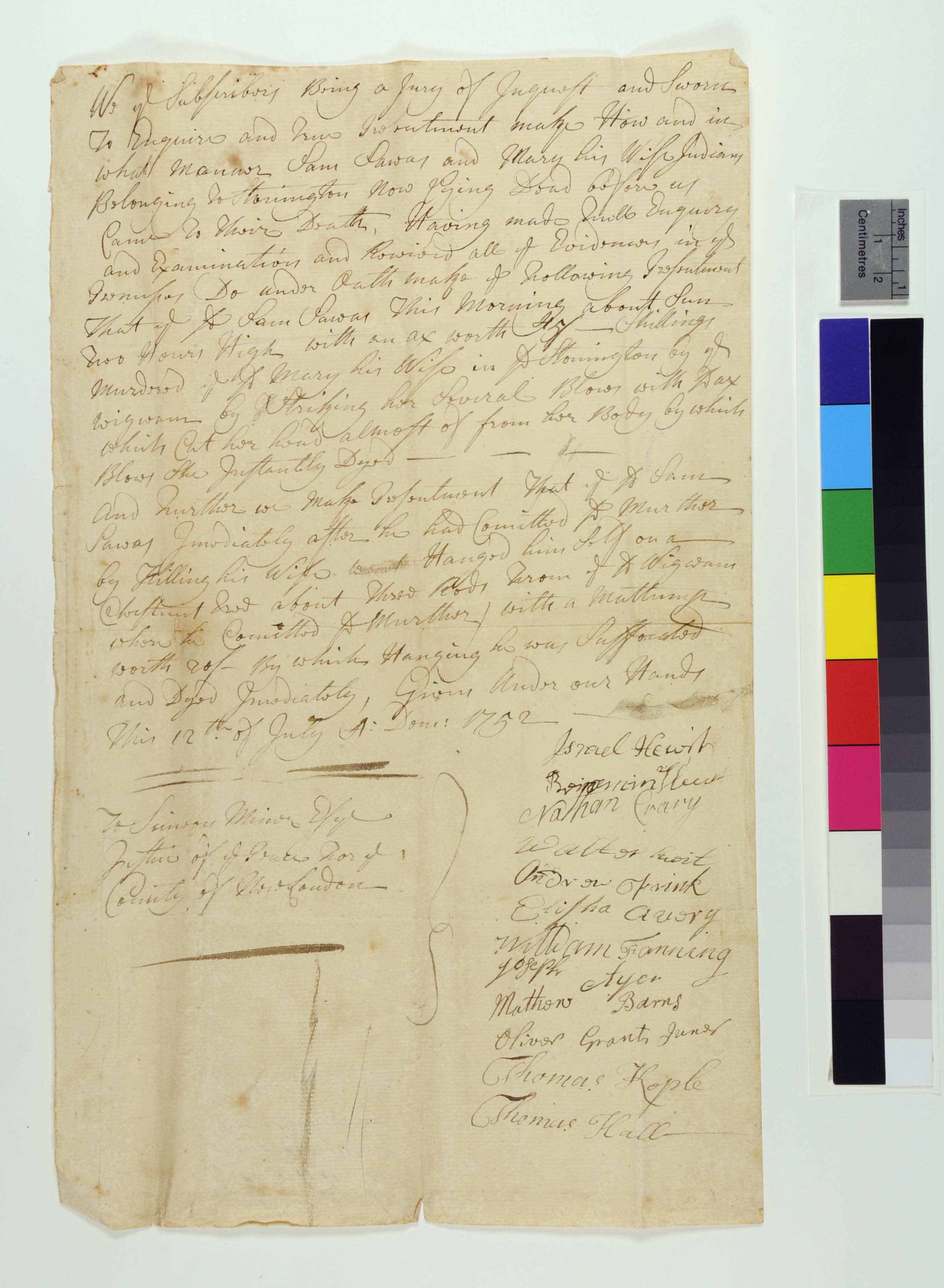 Law -- Procedure -- Return; Repository -- Connecticut State Library; Tool/Weapon -- Axes/Hatchets; Tool/Weapon -- matump; Tribes/Communities -- Pequot -- Eastern; Vital Records -- Deaths -- Murder; Vital Records -- Deaths -- Suicide; YIPP -- Colony of Connecticut Collection, 1603-1783