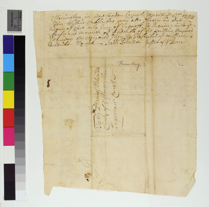 Buildings/Structures -- Barns; Law -- Procedure -- Return; Repository -- Connecticut State Library; Tool/Weapon -- matump; Tribes/Communities -- Pequot -- Eastern; Vital Records -- Deaths -- Suicide; YIPP -- Colony of Connecticut Collection, 1603-1783