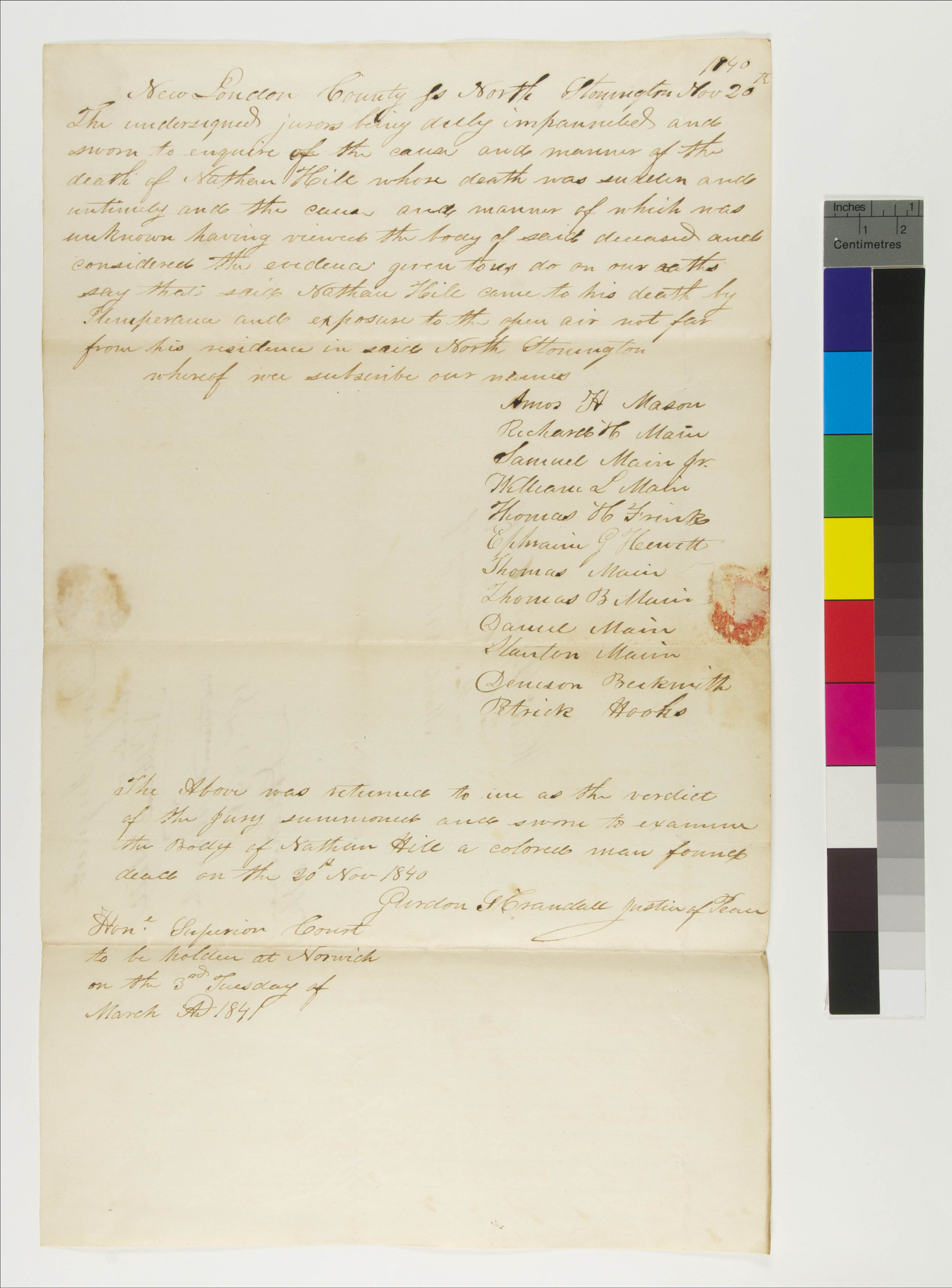 Inquest over the Body of Nathan Hill, November 20, 1840, (1840.11.20.00), Grant-Costa, Paul, and Tobias Glaza, eds., Yale Indian Papers Project, Yale University, http://jake.library.yale.edu:8080/neips/data/html/1840.11.20.00/1840.11.20.00.html.