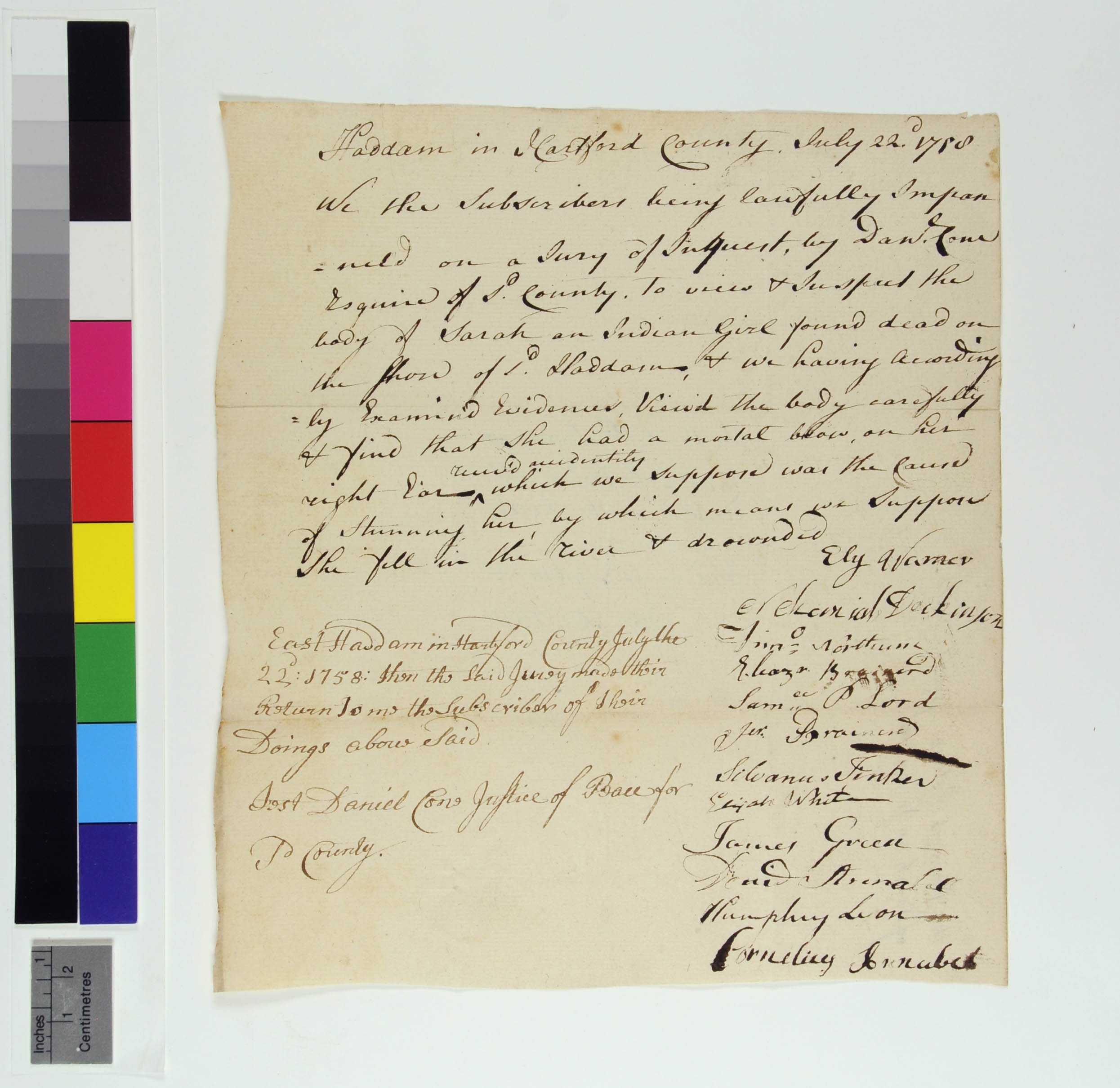 Inquest over the Body of Sarah , an Indian Girl, July 22, 1758, (1758.07.22.00), Grant-Costa, Paul, and Tobias Glaza, eds., Yale Indian Papers Project, Yale University, http://jake.library.yale.edu:8080/neips/data/html/1758.07.22.00/1758.07.22.00.html.