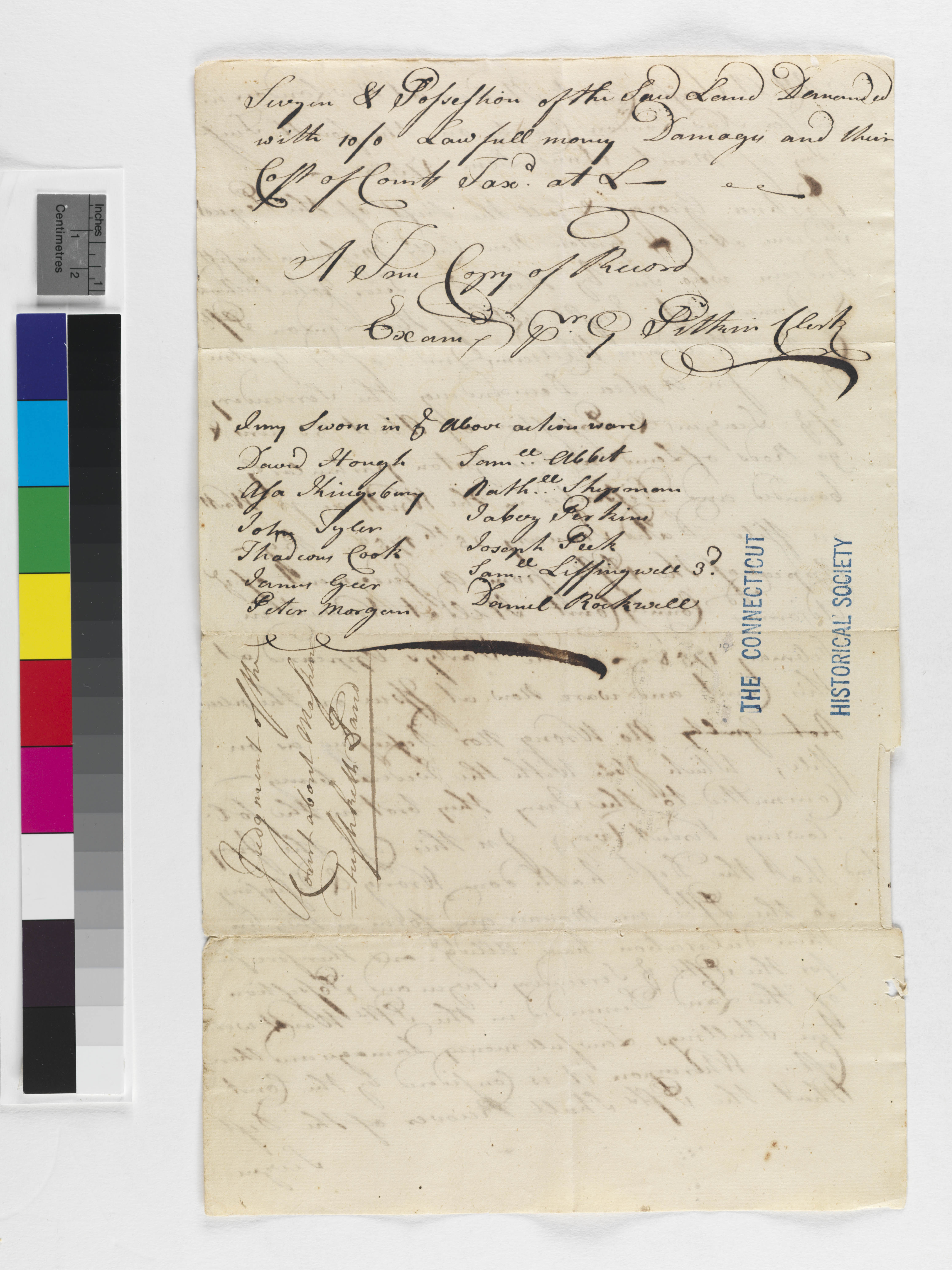 Abbot, Samuel (Juror); Coit, Daniel (Mentioned within document); Cook, Thaddeous (Juror); Geer, James (Juror); George, Joshua (Mentioned within document); Hough, David (Juror); Kingsbury, Asa (Juror); Leffingwell, Samuel (Juror); Morgan, Peter (Juror); Peck, Joseph (Juror); Perkins, Jabez (Juror); Pitkin, George (Attestor); Richards, John (Mentioned within document); Rockwell, Daniel (Juror); Shipman, Nathaniel (Juror); Tyler, John (Juror); Unknown (Recipient); Williams, William, Jr (Mentioned within document)