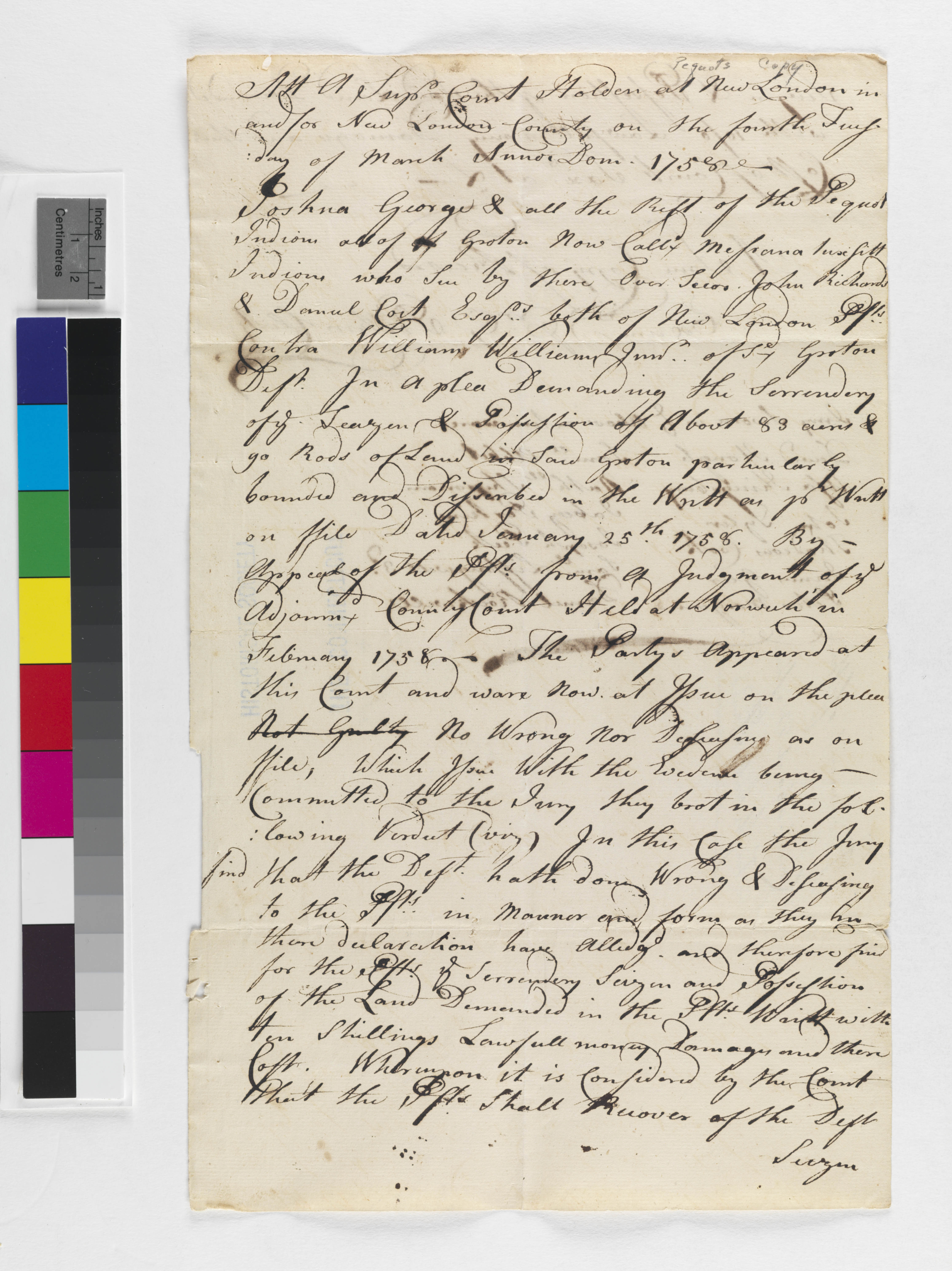 Judgement regarding Mashantucket Land, March 1758, (1758.03.28.00), Grant-Costa, Paul, and Tobias Glaza, eds., Yale Indian Papers Project, Yale University, http://jake.library.yale.edu:8080/neips/data/html/1758.03.28.00/1758.03.28.00.html.