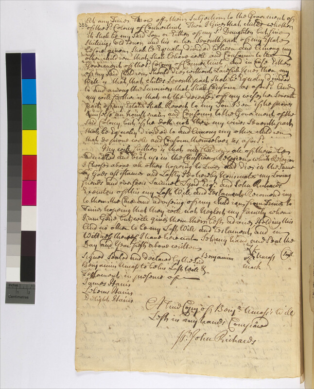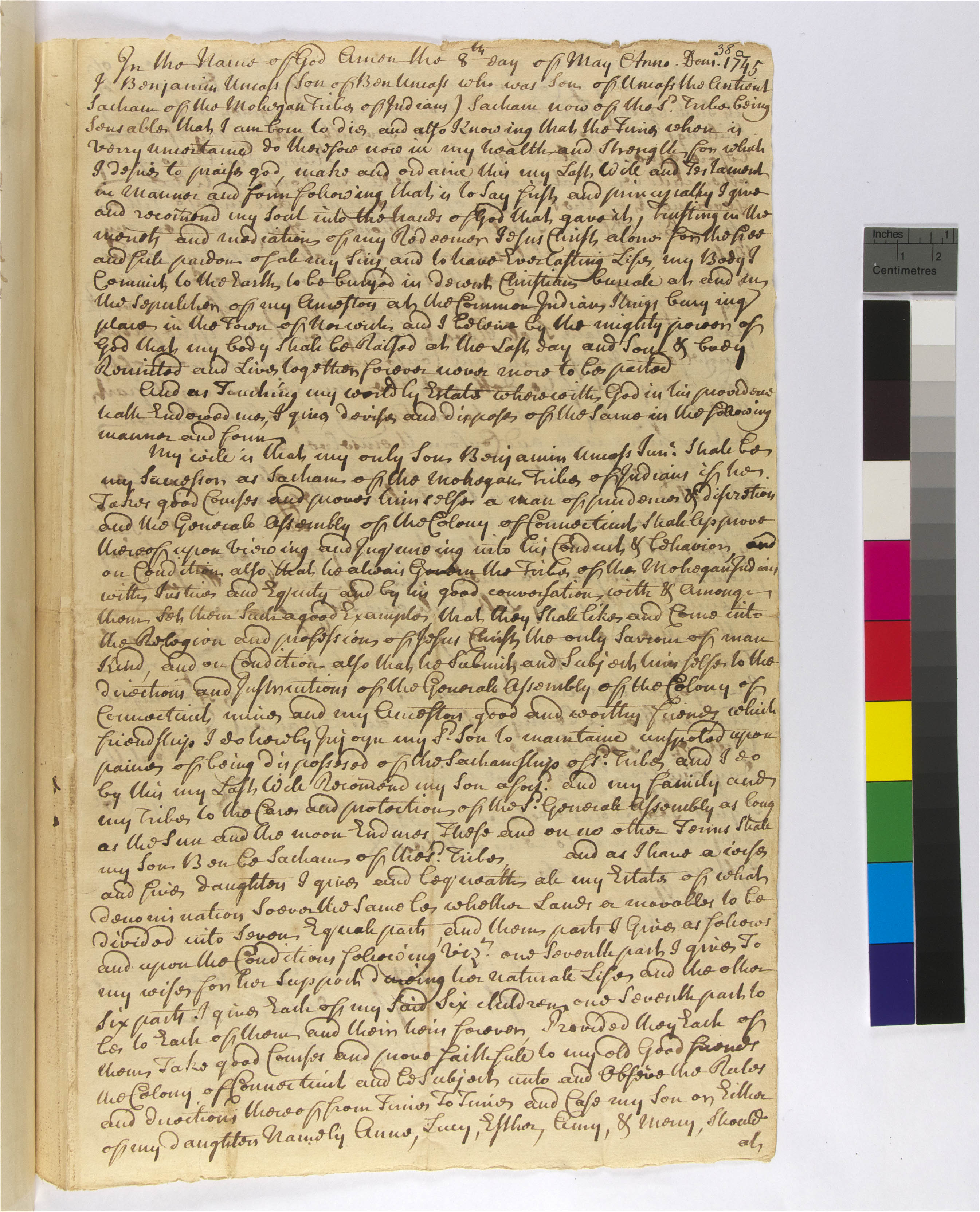Abstract Ideas -- Authority; Abstract Ideas -- Fidelity; Culture -- Genealogy; Culture -- Inheritance; Culture -- Leadership; Education/Schools; Genealogy; Government -- Colonial -- Colony of Connecticut -- General Assembly; Government -- Tribal -- Mohegan -- Pro-Government Faction -- Sachems/Sagamores -- Ben Uncas II (1726-1746); Land -- Conveyances -- Probate; Land -- Reservation/Reserve -- Mohegan; Land -- Use -- Burial; Law -- Civil Actions -- Property Issues -- Estates/Inheritances; Law -- Civil Actions -- Property Issues -- Probate; Relations -- Colonial Affairs; Relations -- Tribal Affairs; Religion/Beliefs -- Christianity; Tribes/Communities -- Mohegan; YIPP -- Colony of Connecticut Collection, 1603-1783