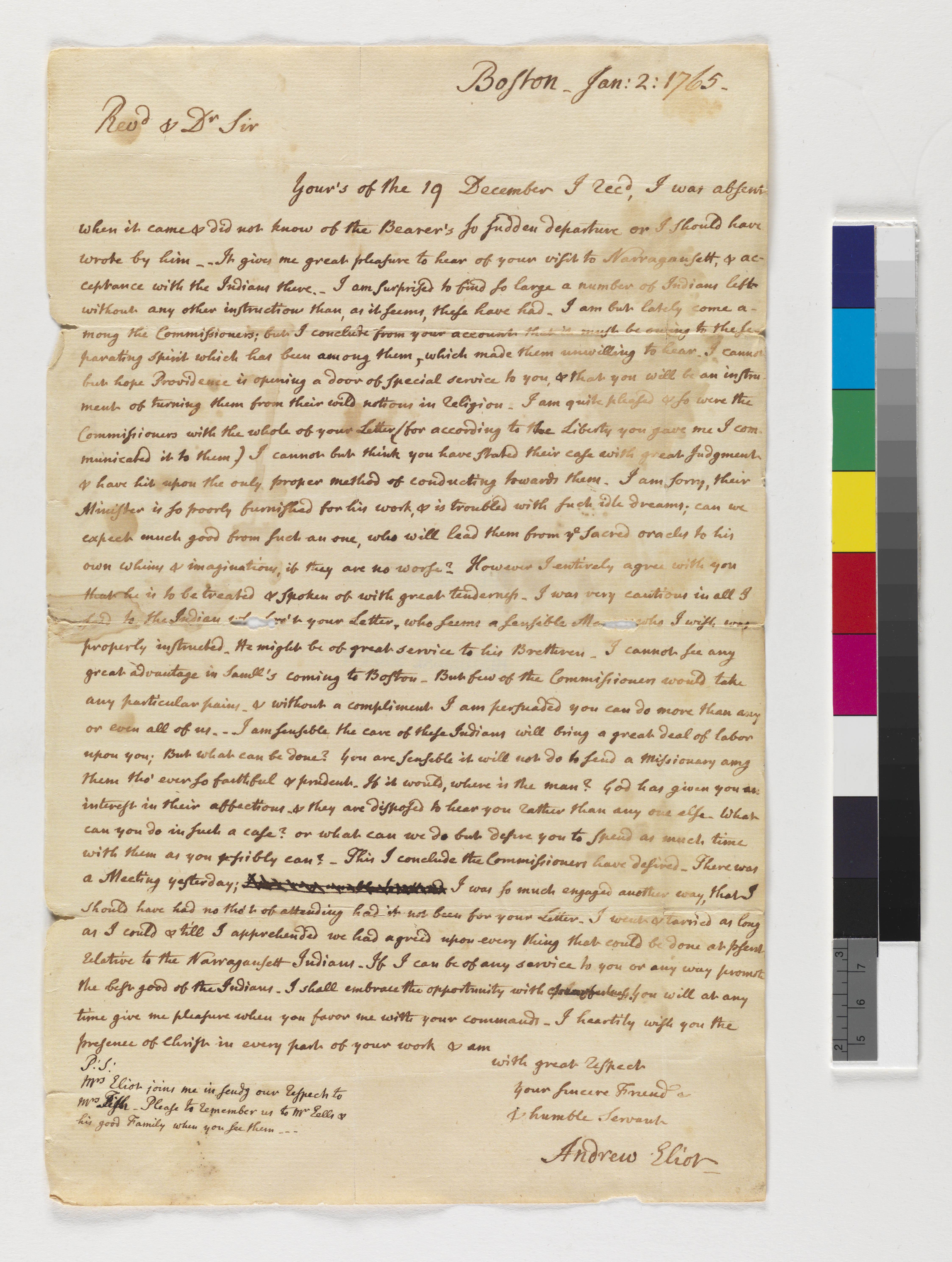 Letter from Andrew Eliot to Joseph Fish, January 2, 1765, (1765.01.02.00), Grant-Costa, Paul, et. al., eds., Yale Indian Papers Project, Yale University, http://jake.library.yale.edu:8080/neips/data/html/1765.01.02.00/1765.01.02.00.html.