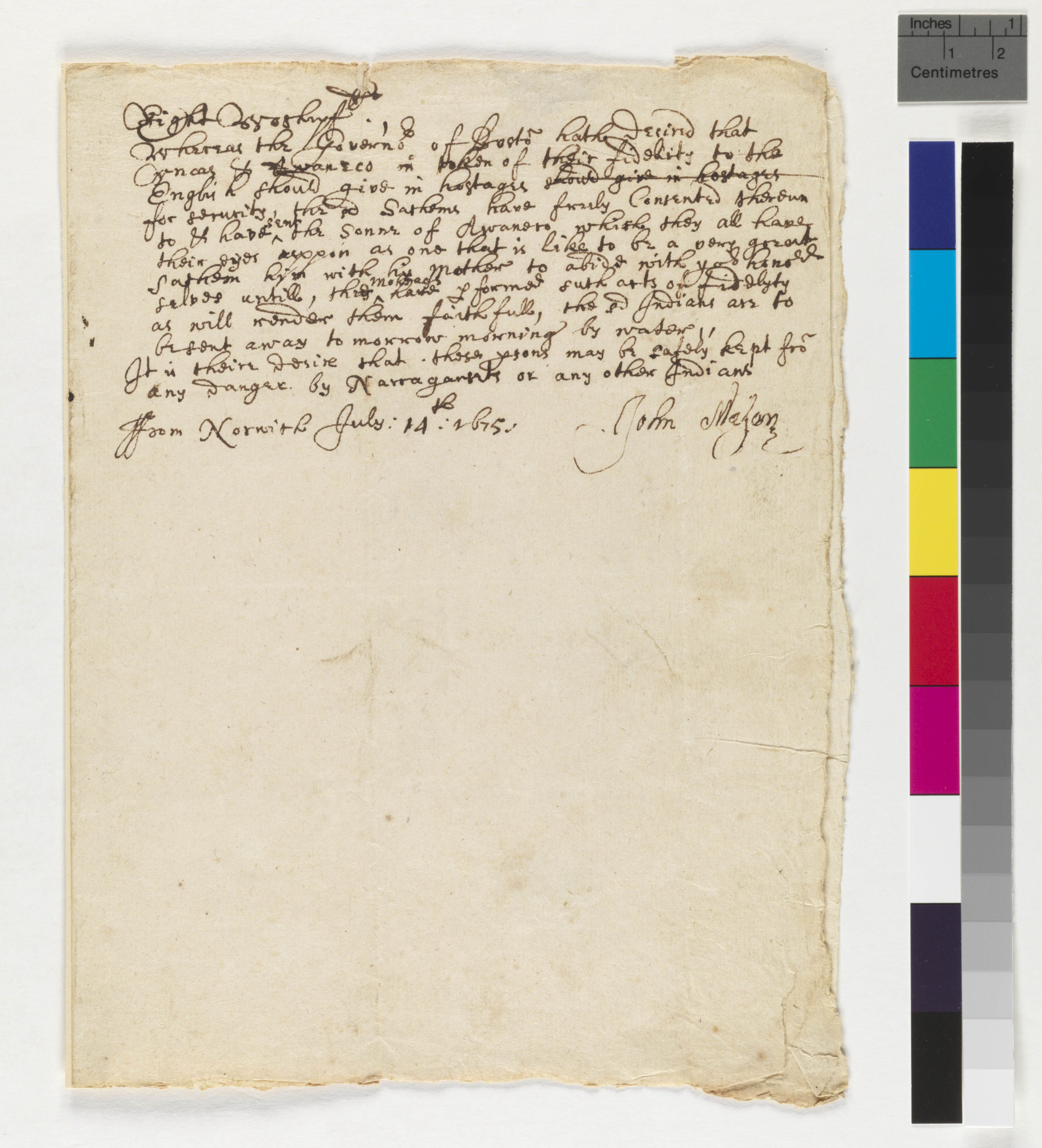 Letter from John Mason to John Winthrop, July 14, 1675, (1675.07.14.01), Grant-Costa, Paul, and Tobias Glaza, eds., Yale Indian Papers Project, Yale University, http://jake.library.yale.edu:8080/neips/data/html/1675.07.14.01/1675.07.14.01.html.