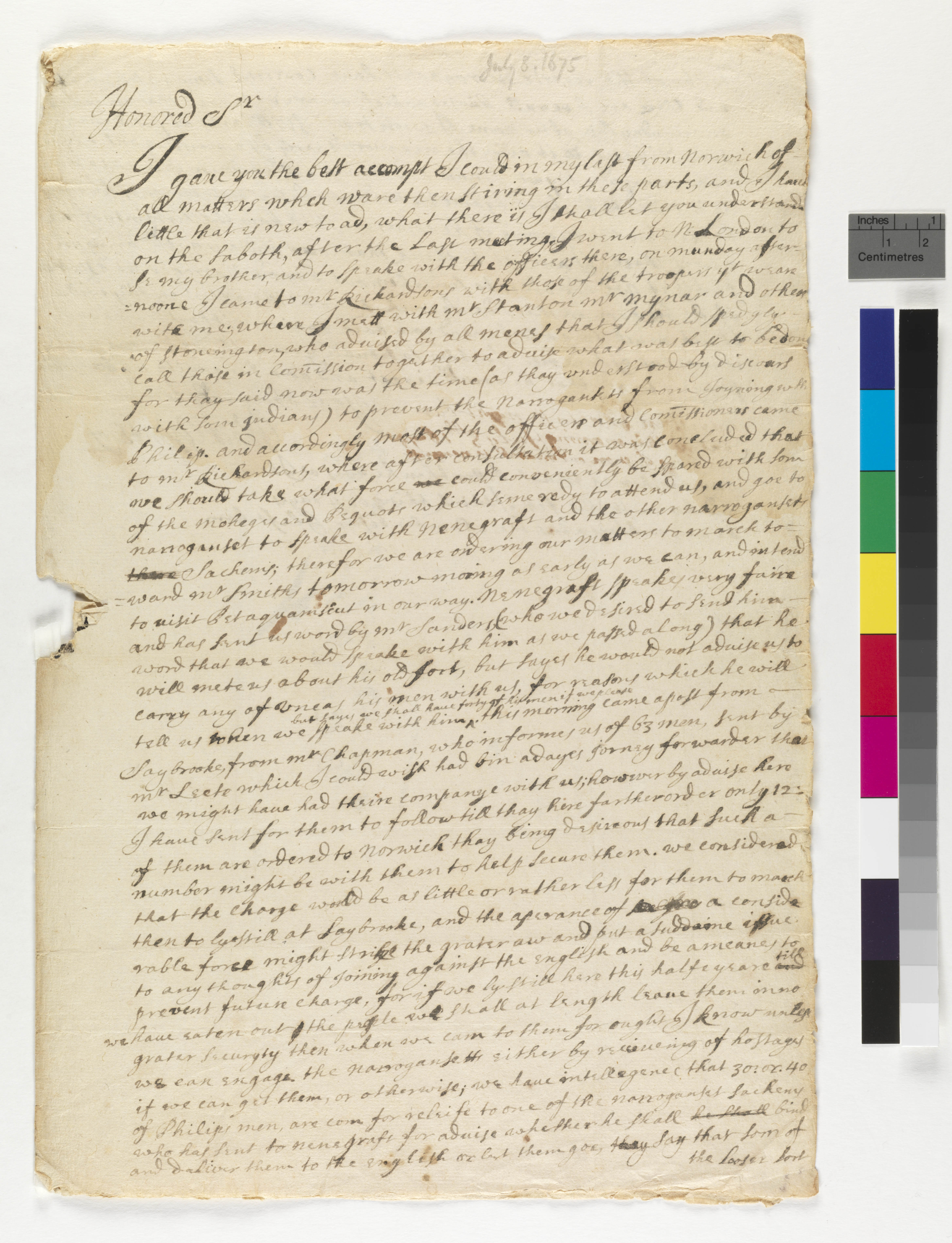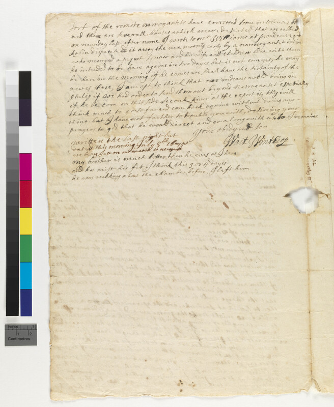 Letter from Wait Winthrop to John Winthrop, Jr., July 8, 1675, (1675.07.08.00), Grant-Costa, Paul, and Tobias Glaza, eds., Yale Indian Papers Project, Yale University, http://jake.library.yale.edu:8080/neips/data/html/1675.07.08.00/1675.07.08.00.html.