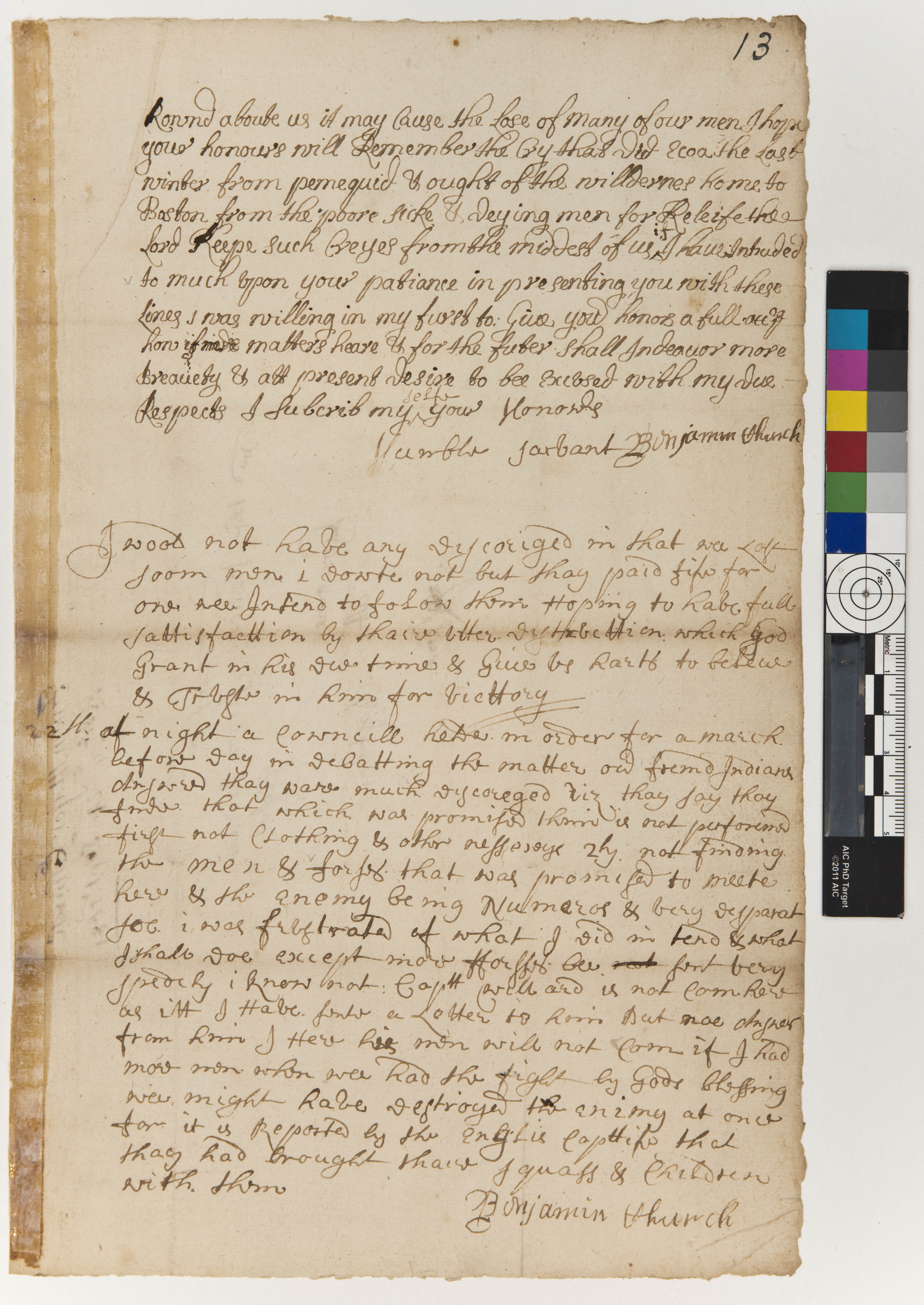 Letter of Benjamin Church to Simon Bradstreet, September 24, 1689, (1689.09.24.00), Grant-Costa, Paul, et. al., eds., Yale Indian Papers Project, Yale University, http://jake.library.yale.edu:8080/neips/data/html/1689.09.24.00/1689.09.24.00.html.