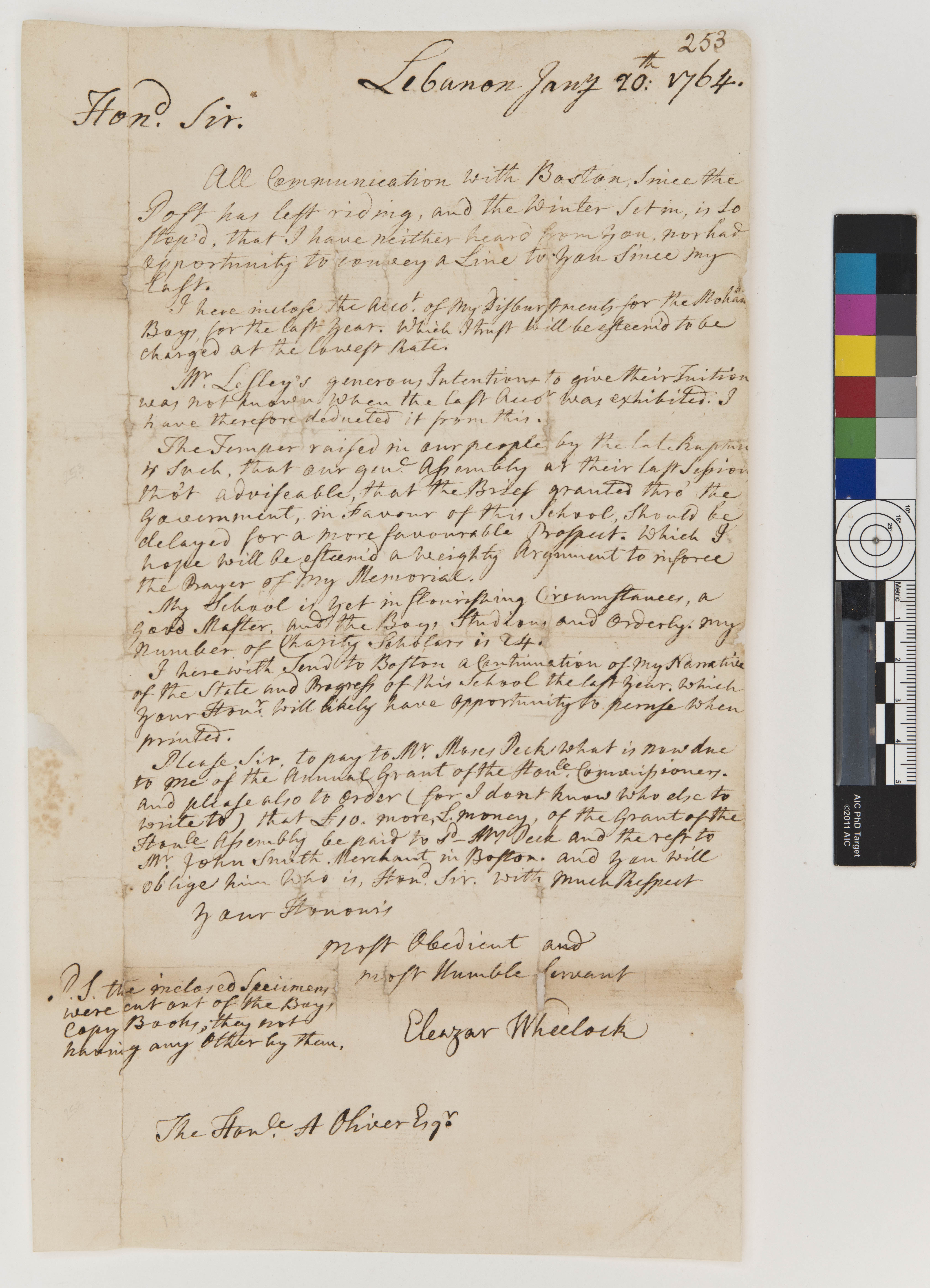 Letter of Eleazar Wheelock to Andrew Oliver, with a Specimen of Student Handwriting