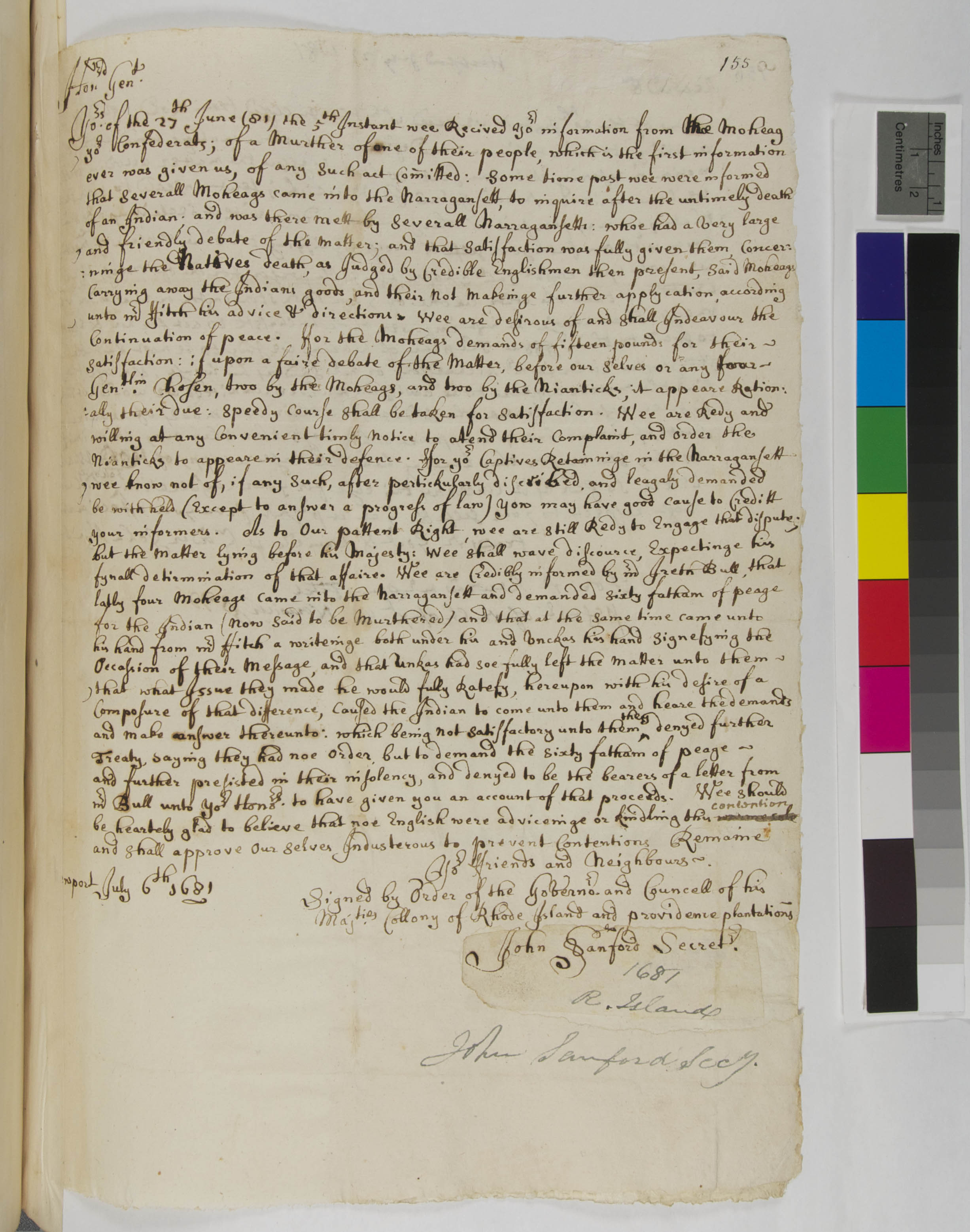 Culture -- Wampum; Government -- Colonial -- Colony of Rhode Island -- Governors; Government -- Imperial -- Agencies -- Commissioners for Trade and Plantations; Government -- Imperial -- Monarchs:: -- Charles Stuart II (1660-1685); Law -- Charters/Patents; Law -- Criminal Actions -- Felonies -- Murder; Military -- Imprisonment/Captivity; Military -- War -- Spoils/Plunder; Relations -- Colonial Affairs; Relations -- Inter-Tribal Affairs; Relations -- Tribal Affairs; Relations -- Violence; Tribes/Communities -- Mohegan; Tribes/Communities -- Narragansett; Tribes/Communities -- Niantic -- Eastern; Vital Records -- Deaths -- Murder; YIPP -- Colony of Connecticut Collection, 1603-1783; YIPP -- Colony of Rhode Island Collection, 1600-1783